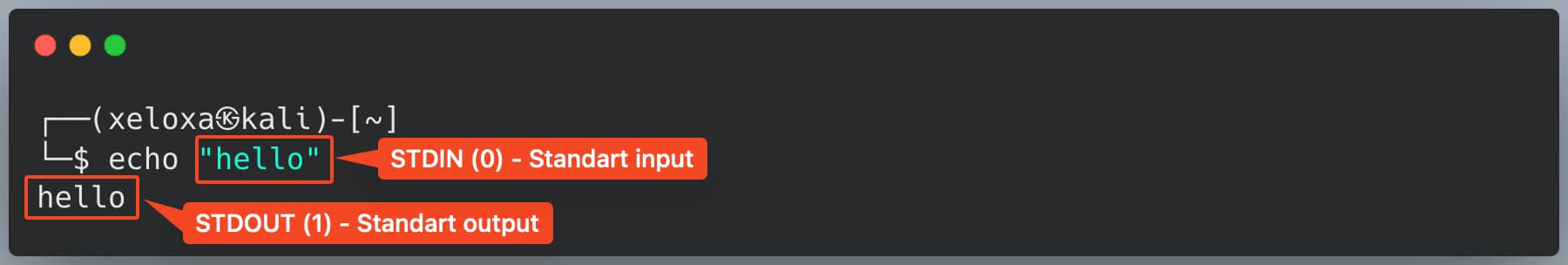 Now, in this command, echo is our application. "hello" is our standard input, i.e., STDIN (0). Similarly, when we enter this command, meaning echo "hello", and press the Enter key, we get hello as our standard output, i.e., STDOUT (1).