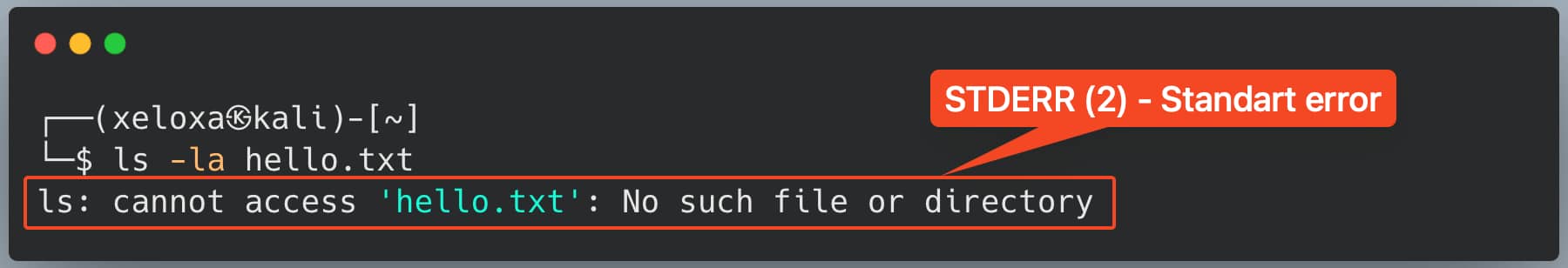 In this example, we used the ls -la hello.txt command to search for the hello.txt file in the directory. I don't actually have a file named hello.txt in my directory. That's precisely our goal – to get an error. As you can see, we received a standard error STDERR (2) like ls: cannot access 'hello.txt': No such file or directory. As you understand, this is a standard error.