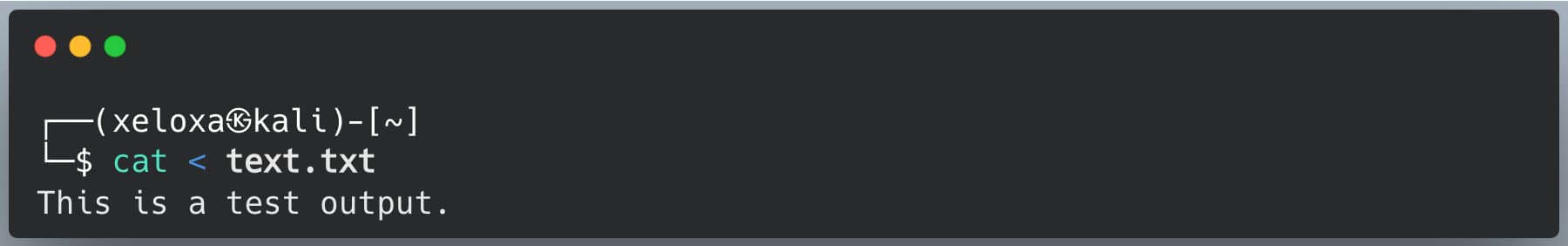 It takes the input for the cat command from the text.txt file and writes its content to STDOUT (the screen). This does the same thing as cat text.txt but demonstrates how redirection works.