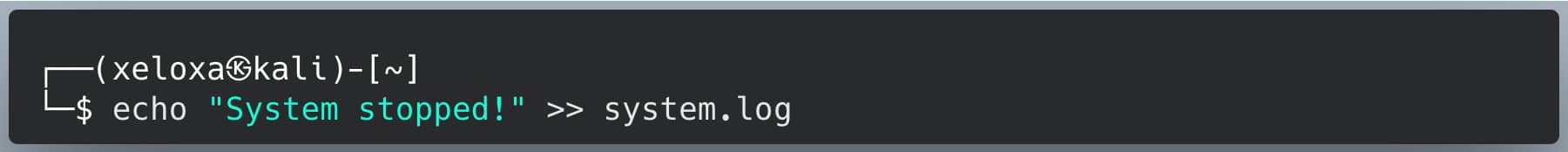 The output of the echo command (System stopped!) is appended to the end of the system.log file. The previous content of the file is preserved.
