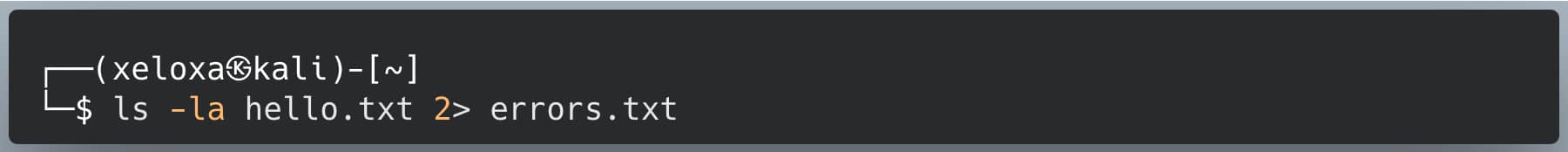 As before, I don't have a file named hello.txt in my directory, so I will get an error, and this error will be written to the file I specified, not to the screen. I achieved this by redirecting STDERR (2). We use numbers when redirecting!
