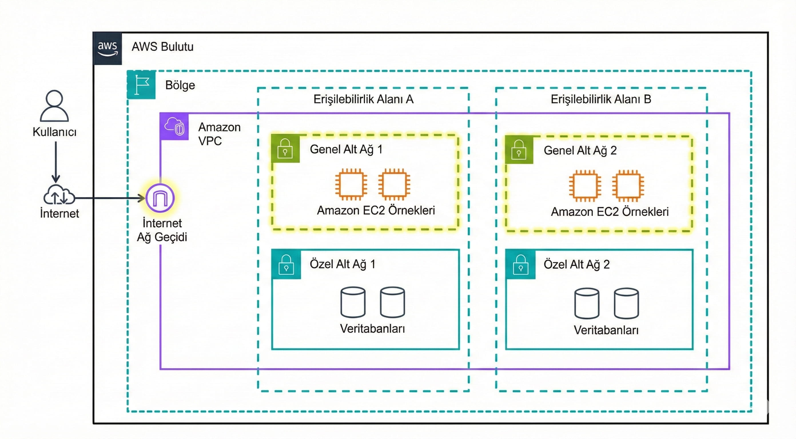 - Özel Alt Ağ (Private Subnet): İnternete kapalıdır. Veritabanları gibi hassas veriler burada tutulur.