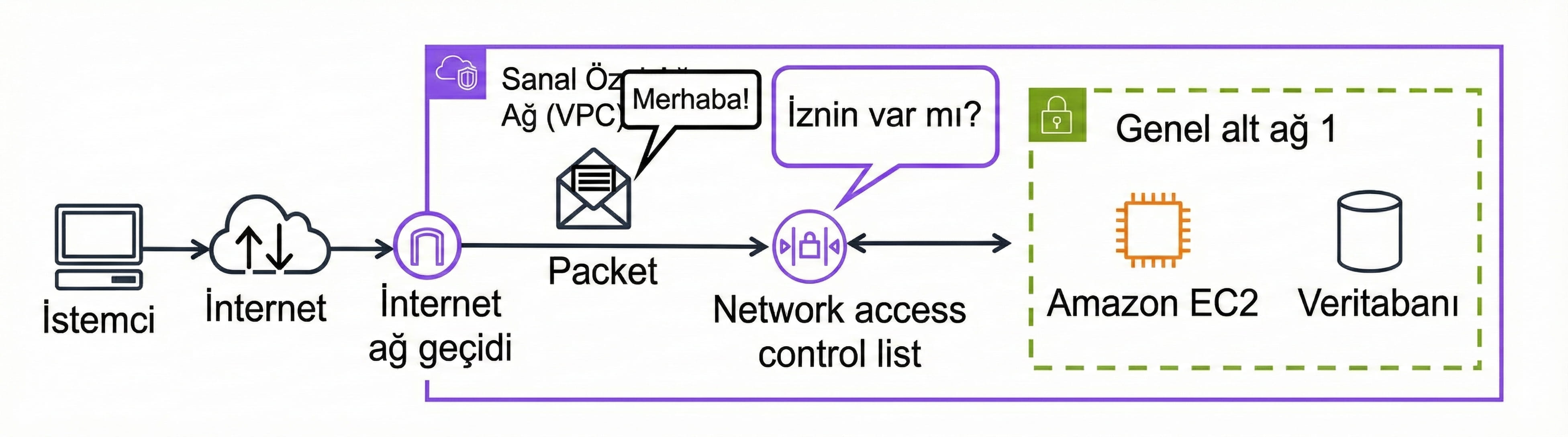 İnternet -> Internet Gateway -> Network ACL -> Alt Ağ -> Security Group -> EC2
