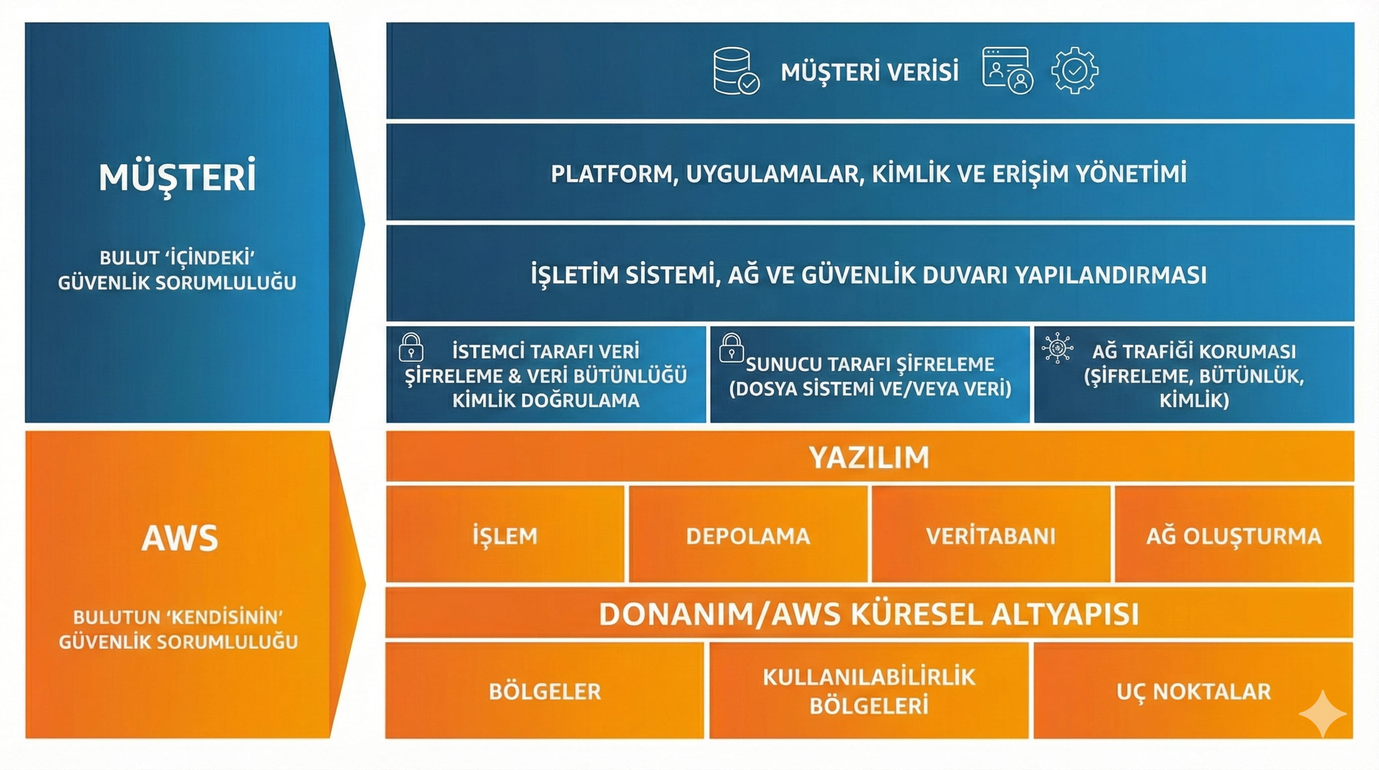 | Security OF the Cloud (Bulutun Güvenliği) | Security IN the Cloud (Bulutun İçindeki Güvenlik) |