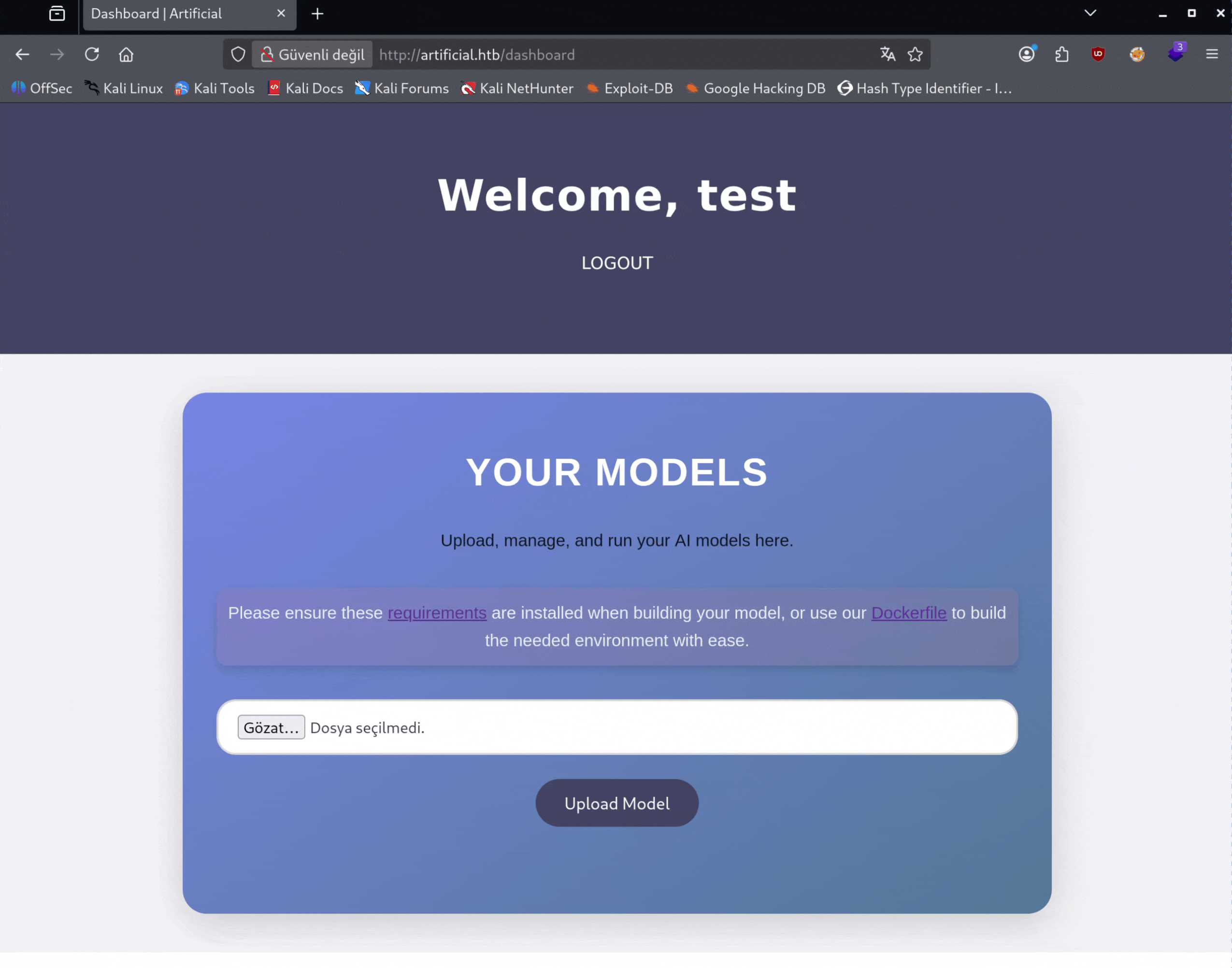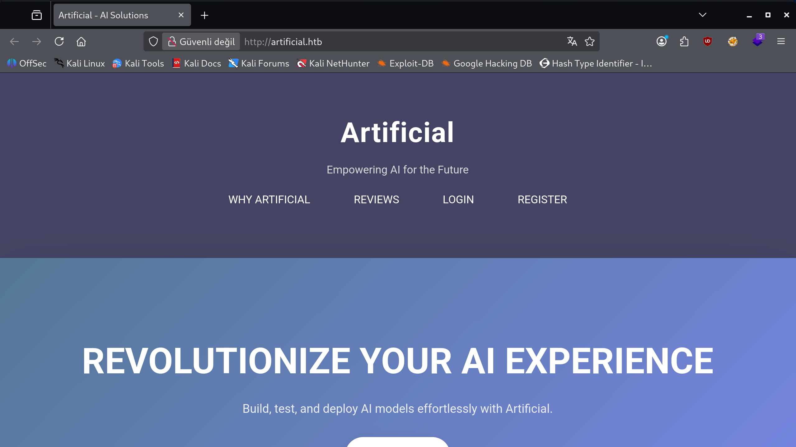 As a result of our scans, we see that ports 22 and 80 are open and we need to redirect to artificial.htb. We can easily do this by adding it to the /etc/hosts file. Now let's take a look at the site.