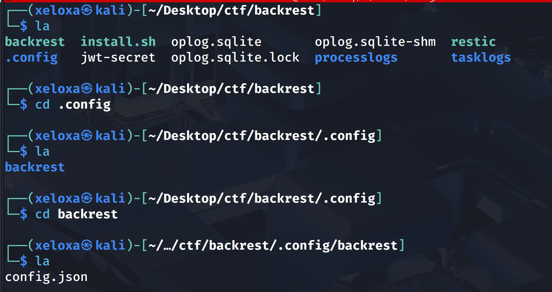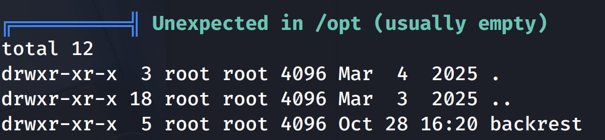 In the output, our attention is drawn to the /opt/backrest/ and /var/backups/backrest_backup.tar.gz backup file. When we examine /opt/backrest, we see that we do not have permission for it when we try to look at the configurations from the /opt/backrest/.config/backrest directory.