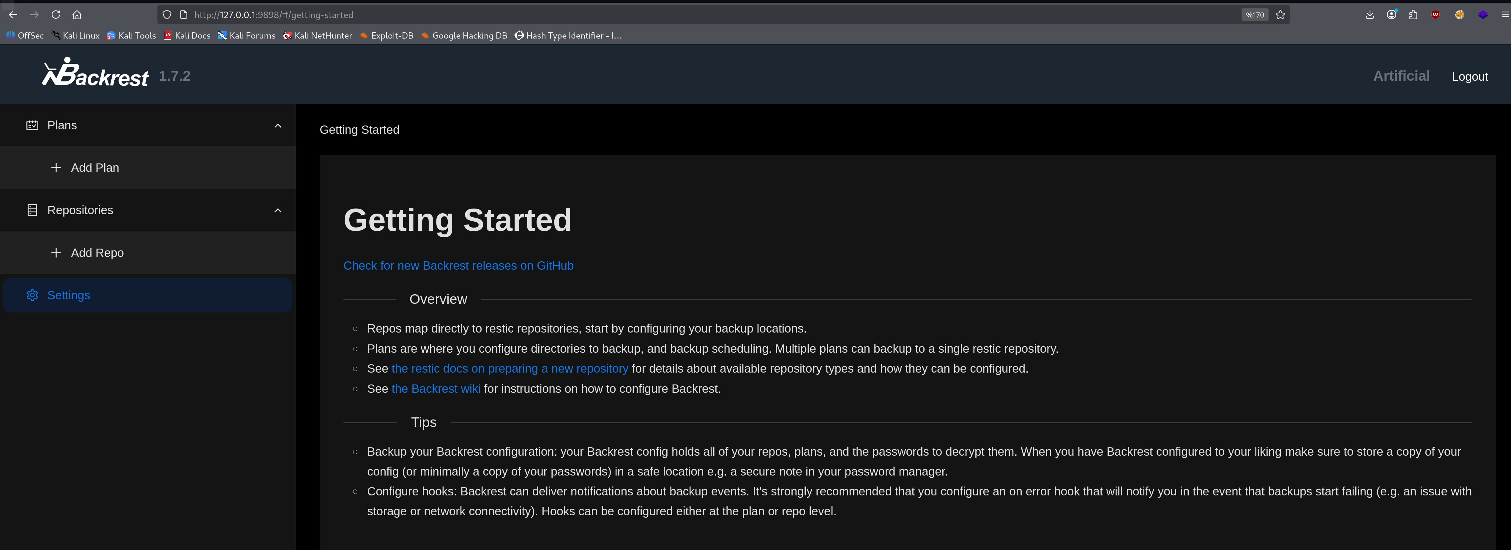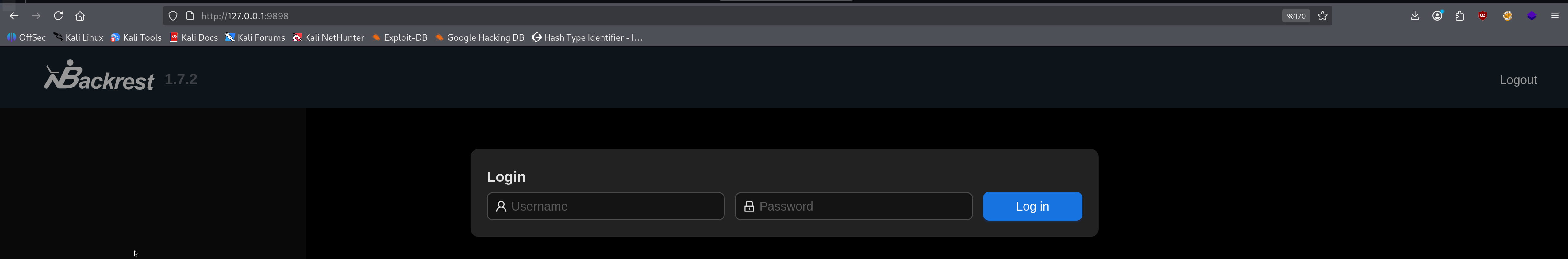 And as a result, we get the pair backrest_root:!@#$%^. With this information, we can log in to our tunneled backrest interface.