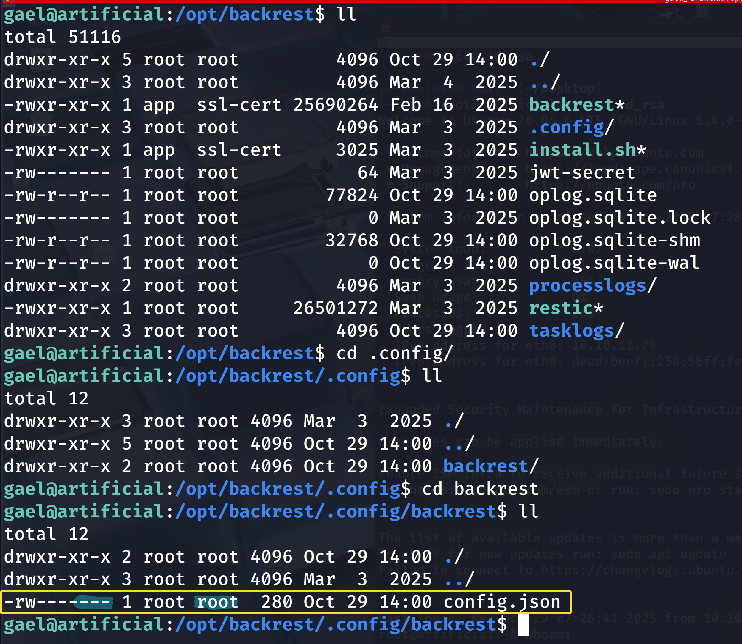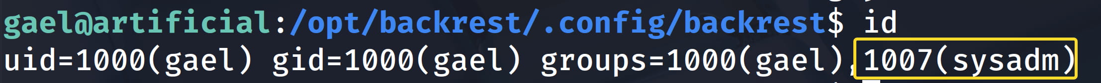 Now let's check the /var/backups/backrest_backup.tar.gz backup file. We see that we have read permission for the sysadm group in this file. When we check with id, the gael user is in the sysadm group.