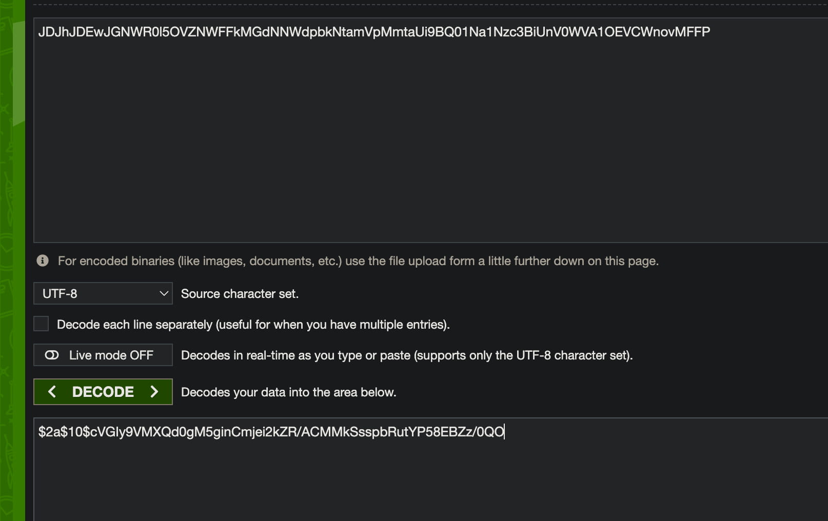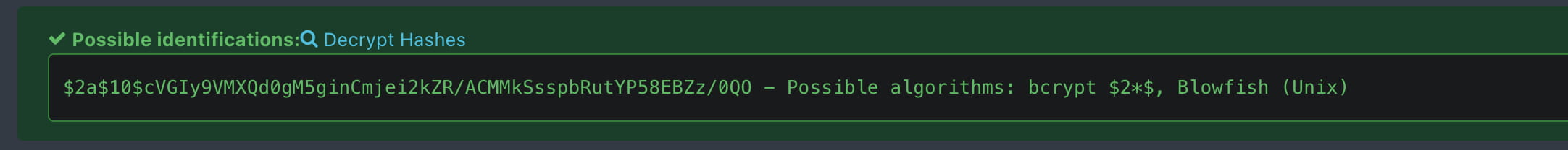 echo '$2a$10$cVGIy9VMXQd0gM5ginCmjei2kZR/ACMMkSsspbRutYP58EBZz/0QO' > hash.txt