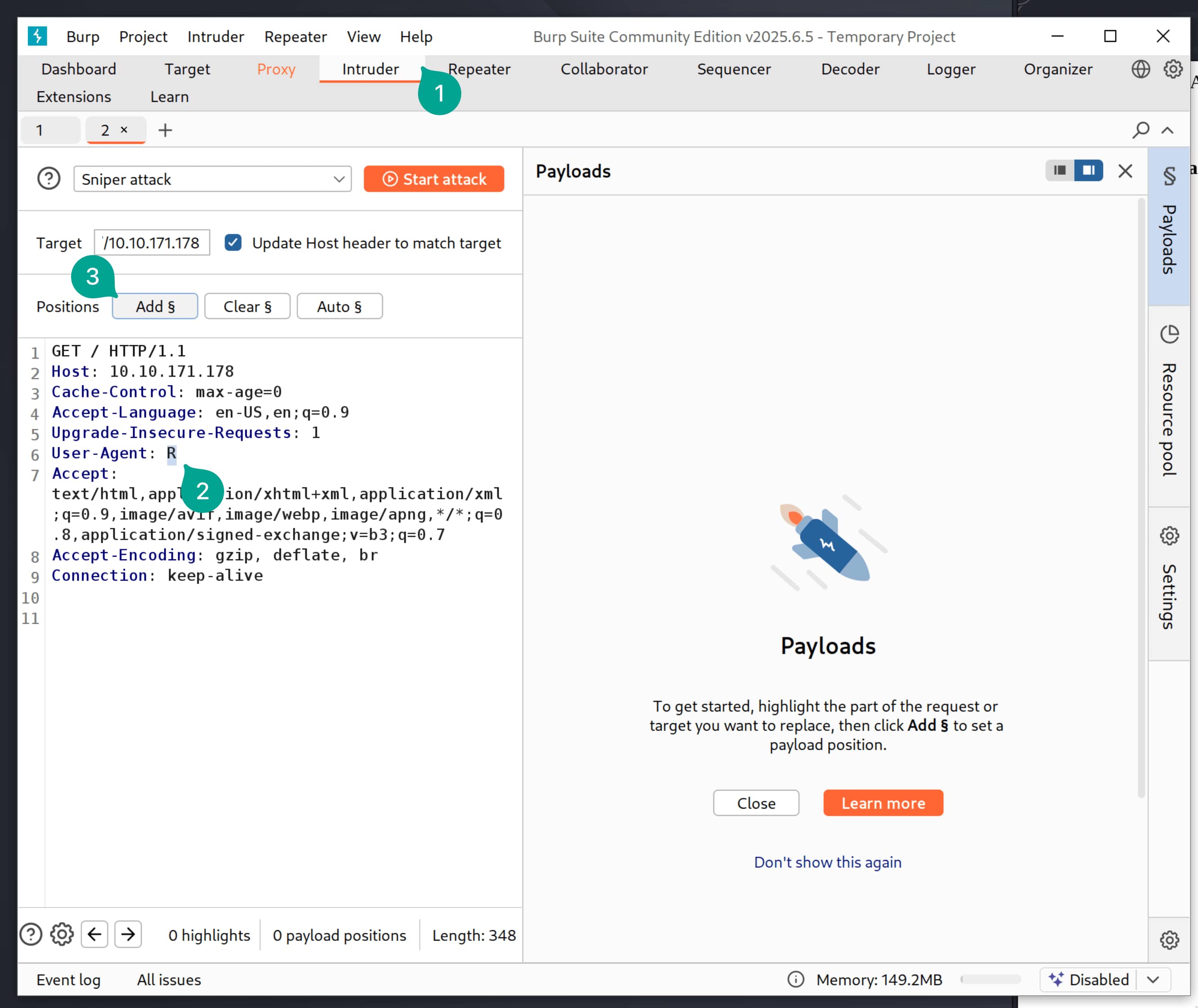 User-Agentvalue and clickAdd. - We will try our letters one by one in the position we added.