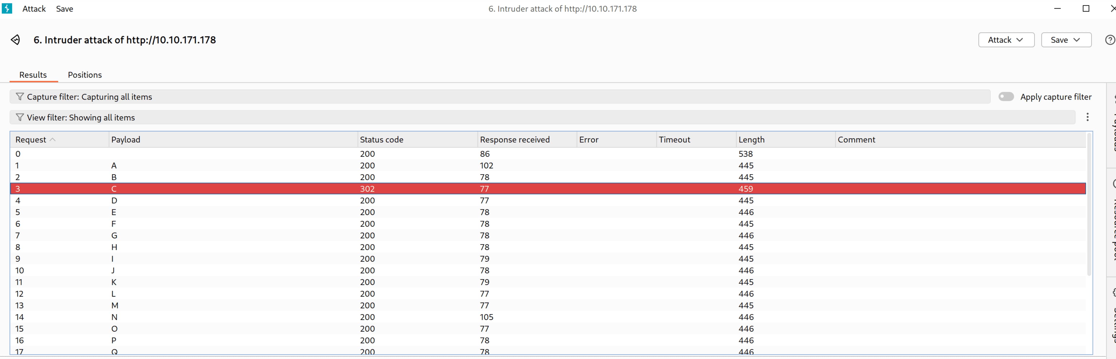 - The attack has started. In the output, one request differs from the others and catches our attention—let’s examine it.