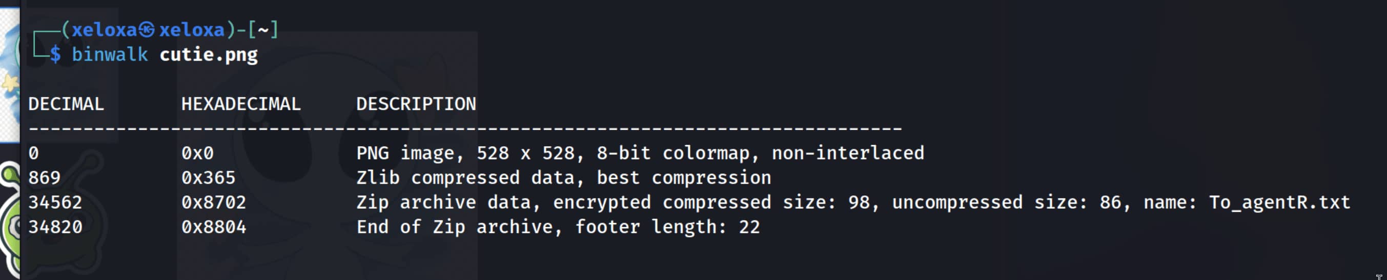 There are many tools for this such as strings, binwalk, xxd, exiftool, steghide, etc. We tried binwalk and found something in the cutie.jpg file.