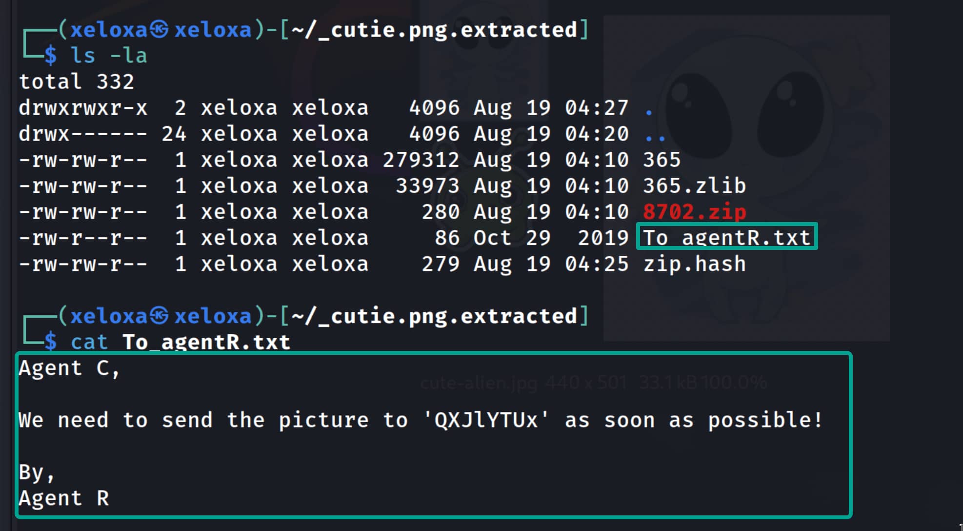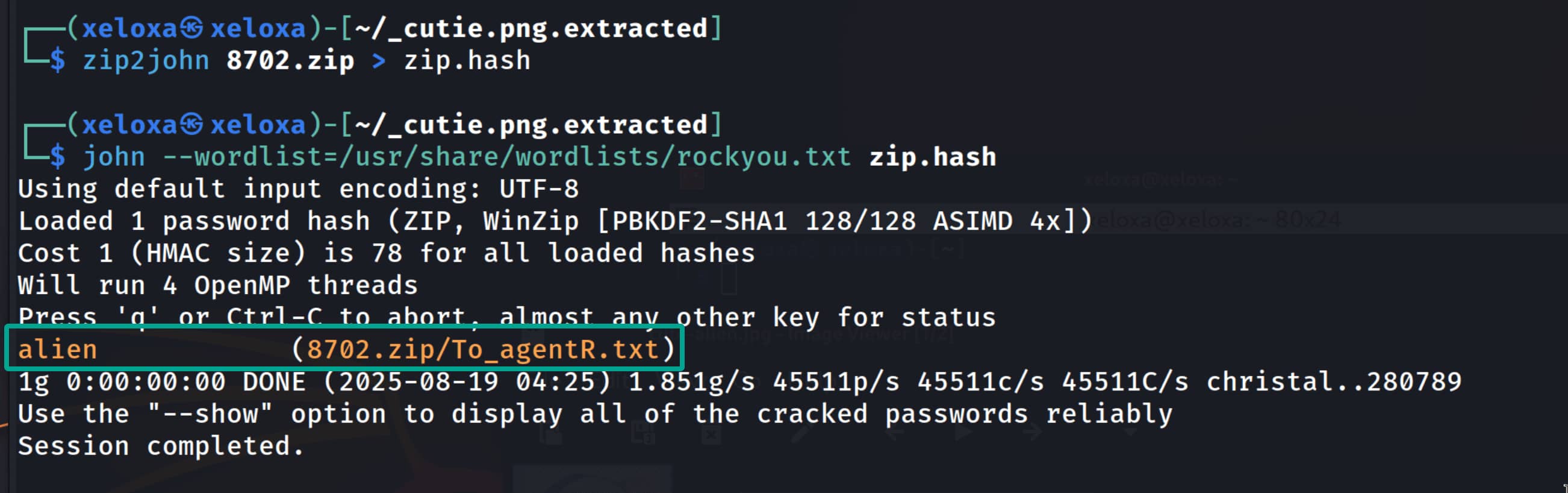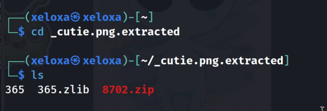 From this output, we understand that a .zip was embedded into the image. Let’s extract them with binwalk -e cutie.jpg.