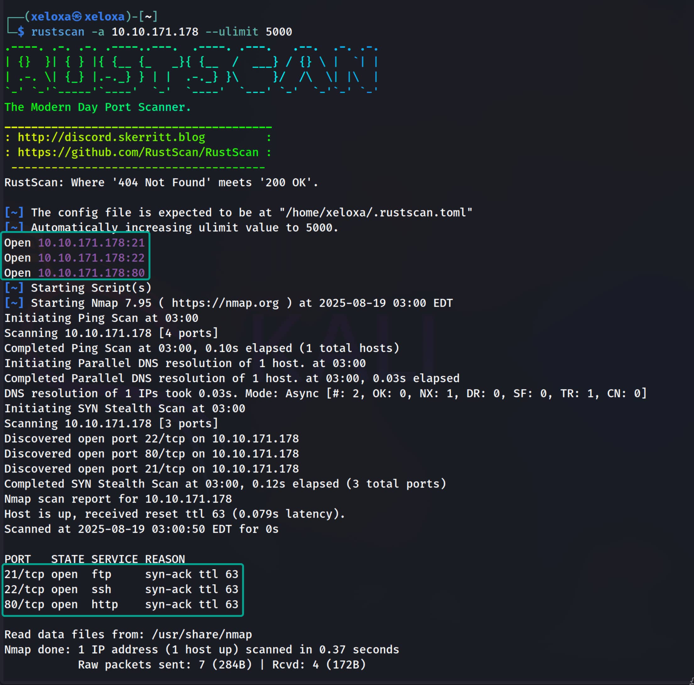 Let us begin by running a port scan on the target. To be fast, we will first use rustscan, then use nmap for an in-depth scan on the discovered ports.