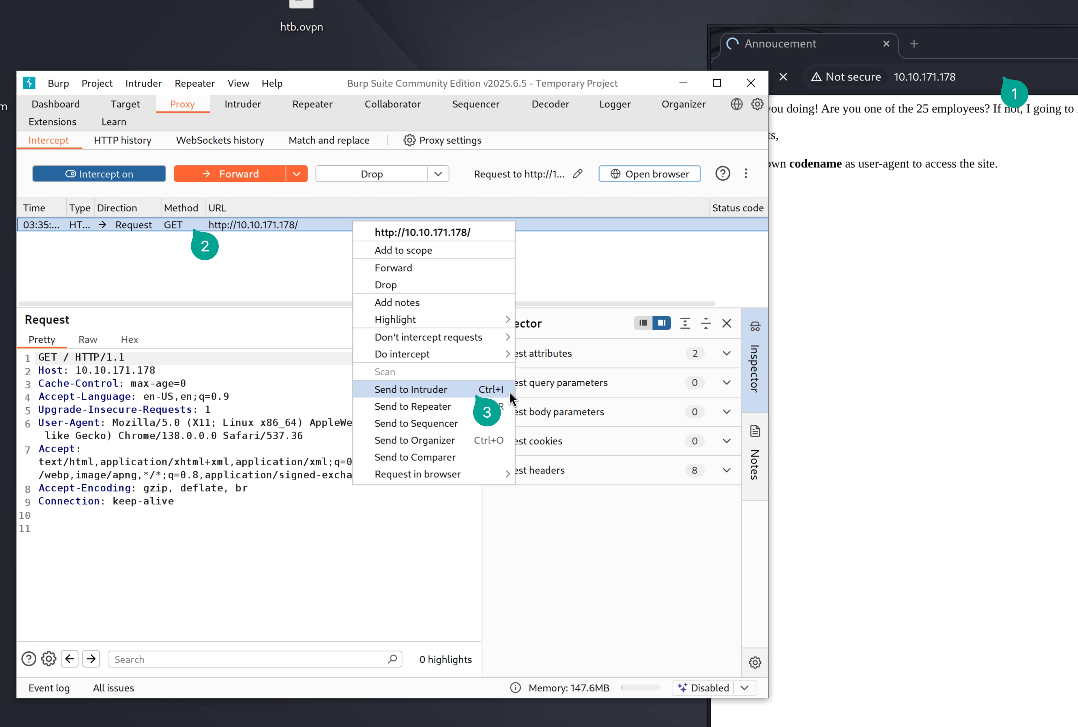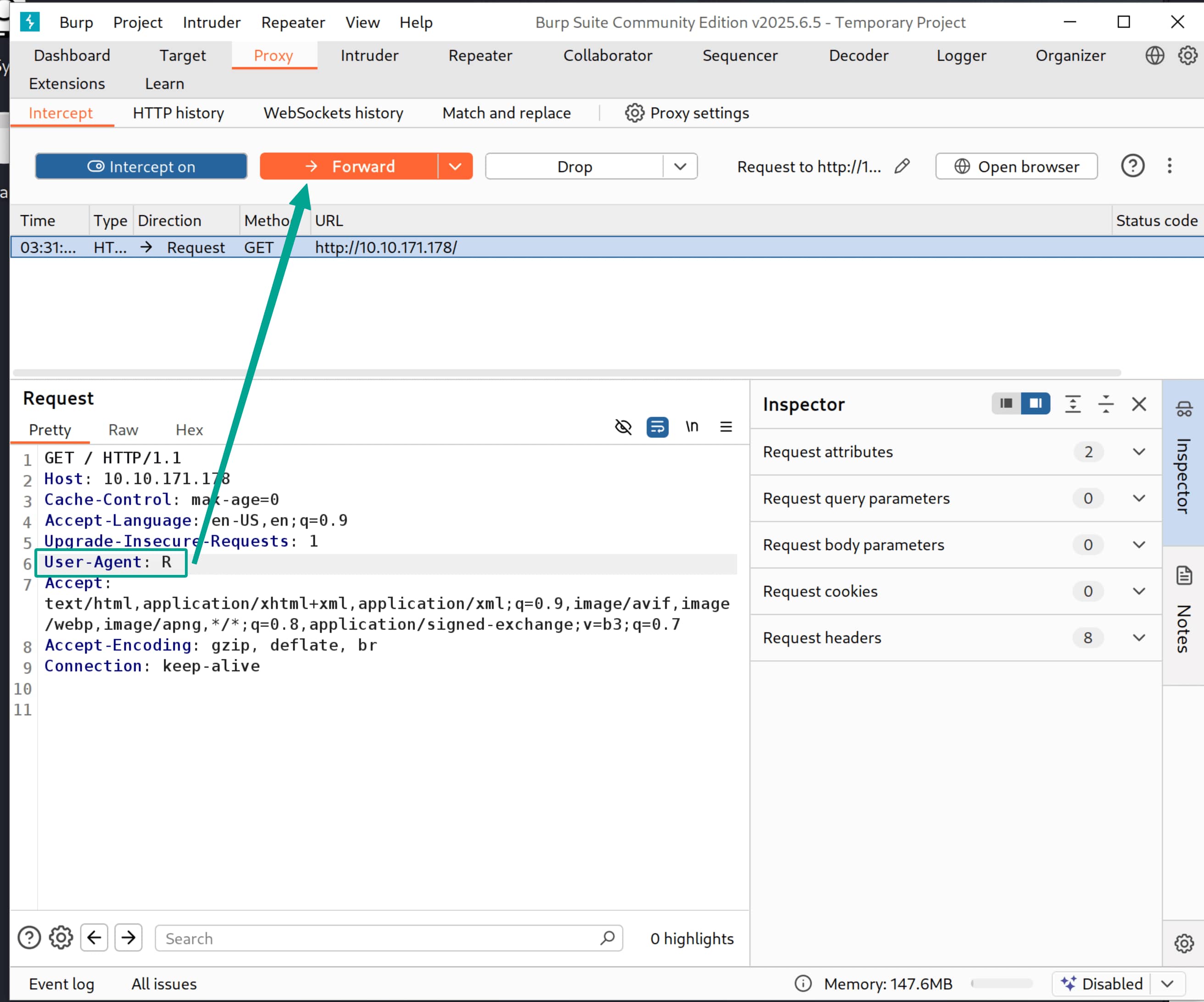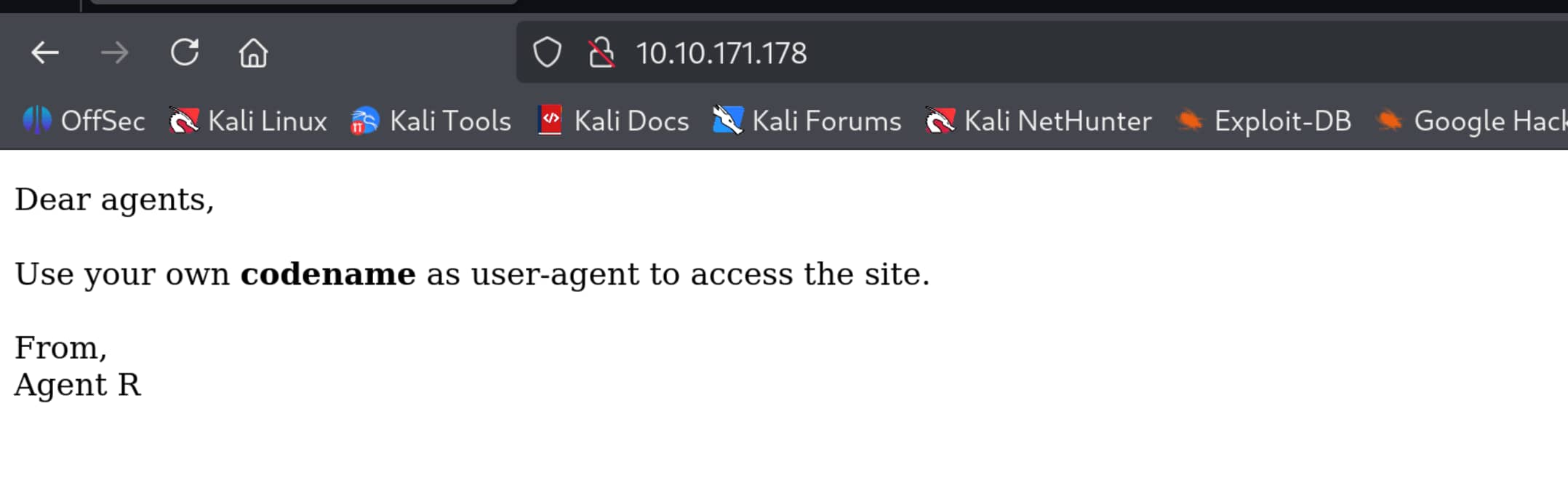 The page tells us what we need to do. To access the site, we must send our own codename as the User-Agent. We do not know our codename, but this message was sent to us by Agent R. So let’s set User-Agent to R and try, because that is the only thing we know right now. I will use BurpSuite for this, though curl, etc., can also be used.
