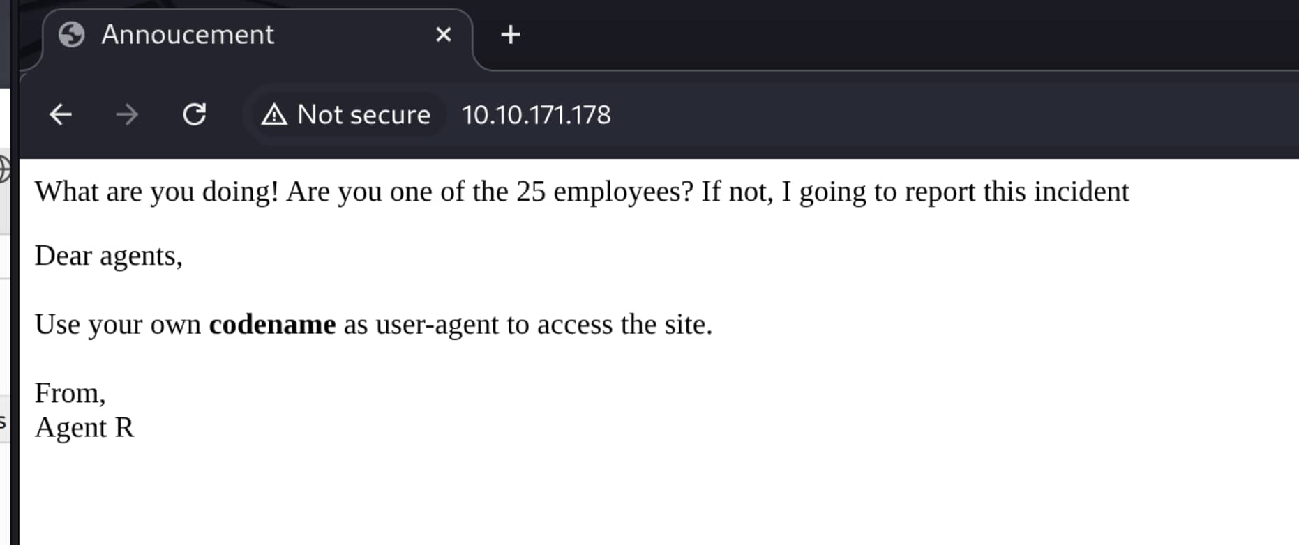 From this we understand there are 25 (active) + 1 (R) = 26 people, i.e., codenames. It occurs to us that there are 26 letters in the English alphabet. What if each letter is set as a codename? If we try all these letters as the User-Agent, we might find something.