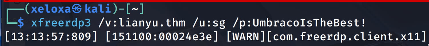 $xfreerdp3 /v:lianyu.thm /u:Administrator /p:ChangeMeBaby1MoreTimeAnd we are root...
