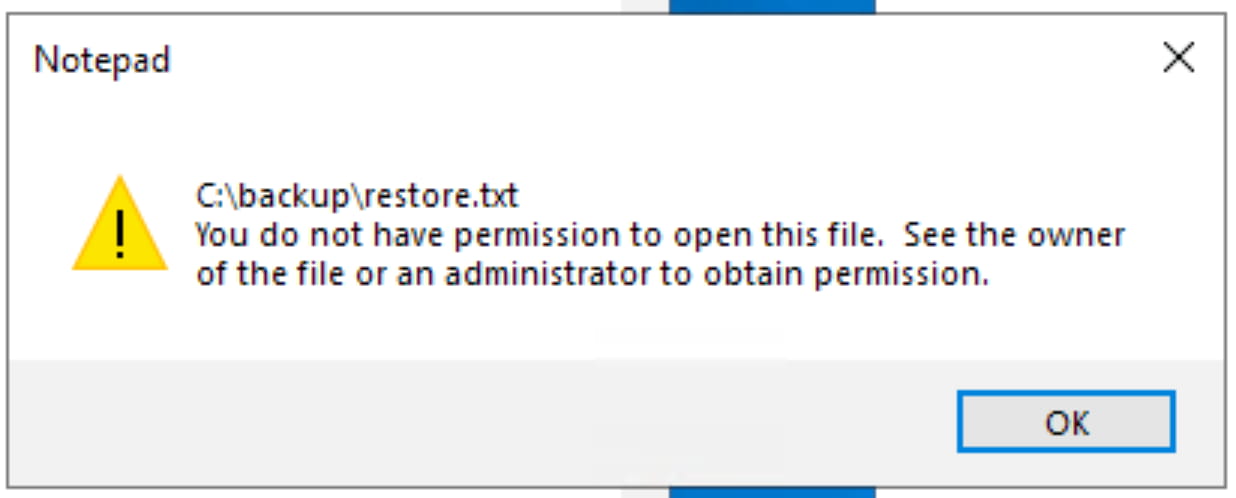 Let's perform a simple scan on the system. Press WIN + R and type recent. This will open a list of recently accessed files. The backup folder catches our attention. Inside, we find a file named restore.txt. However, when we try to open it, we get a permission denied error.
