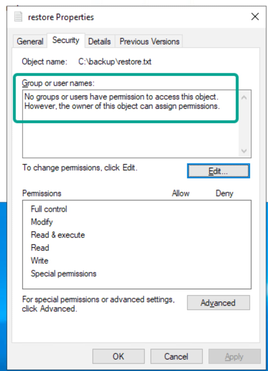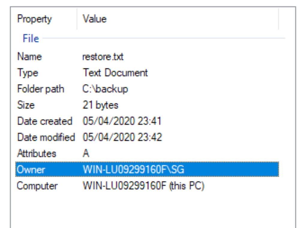 If we right-click the file, go to Properties, and do a quick analysis, we see that we are already the owner of the file.