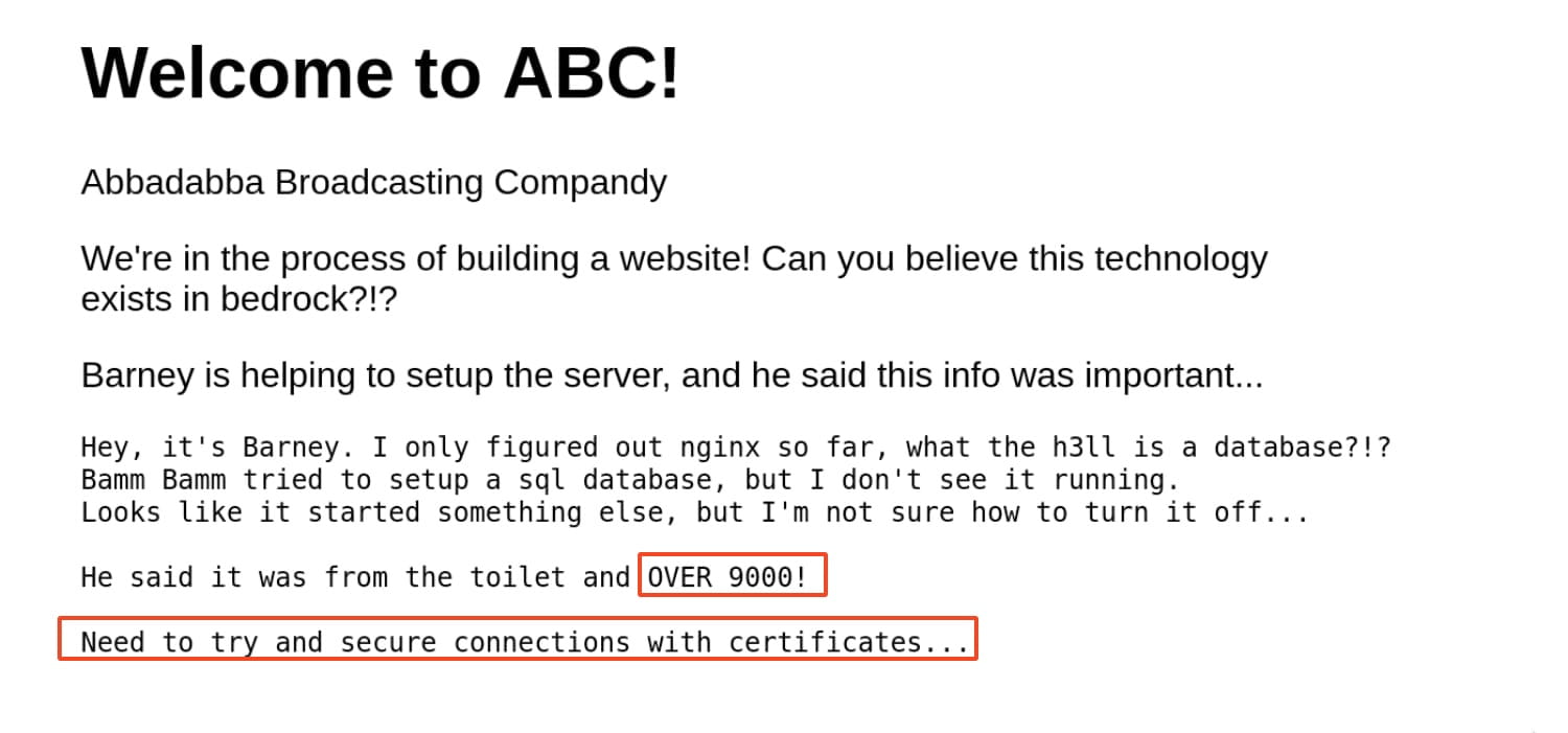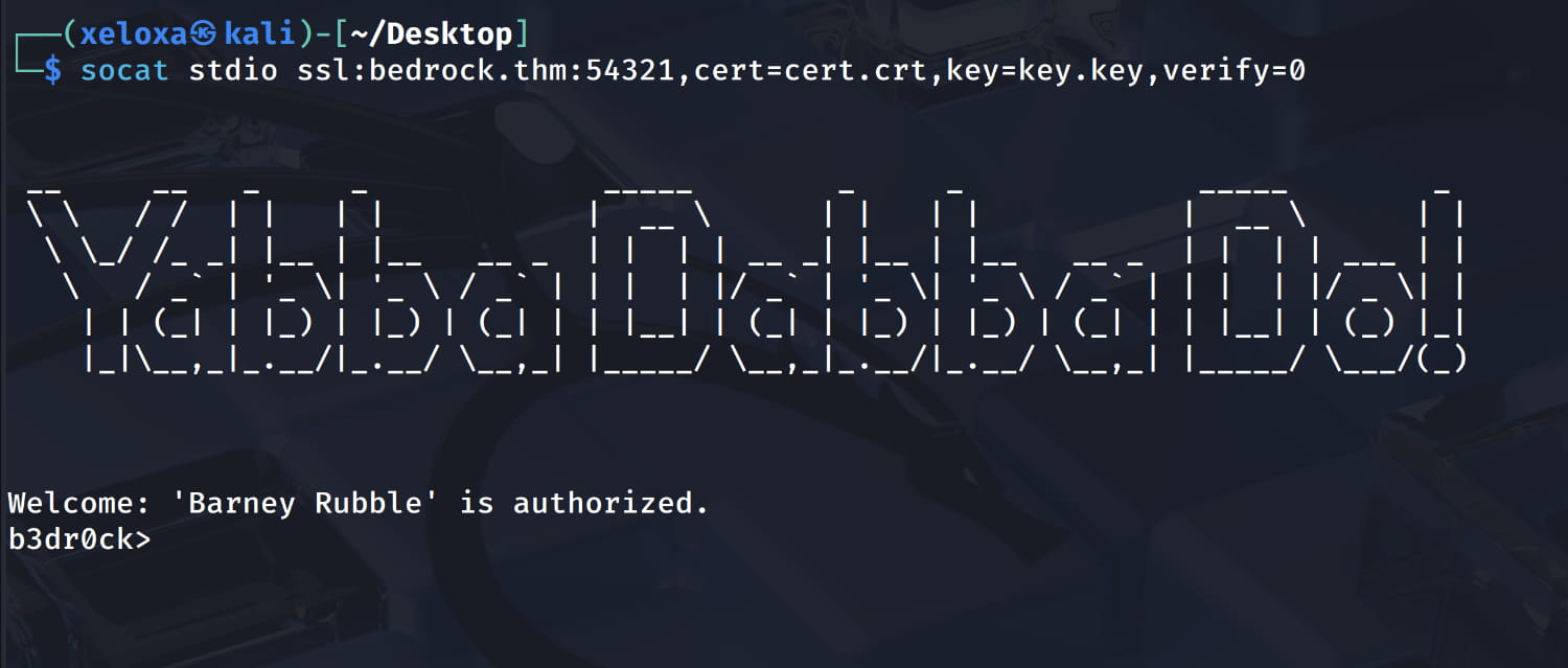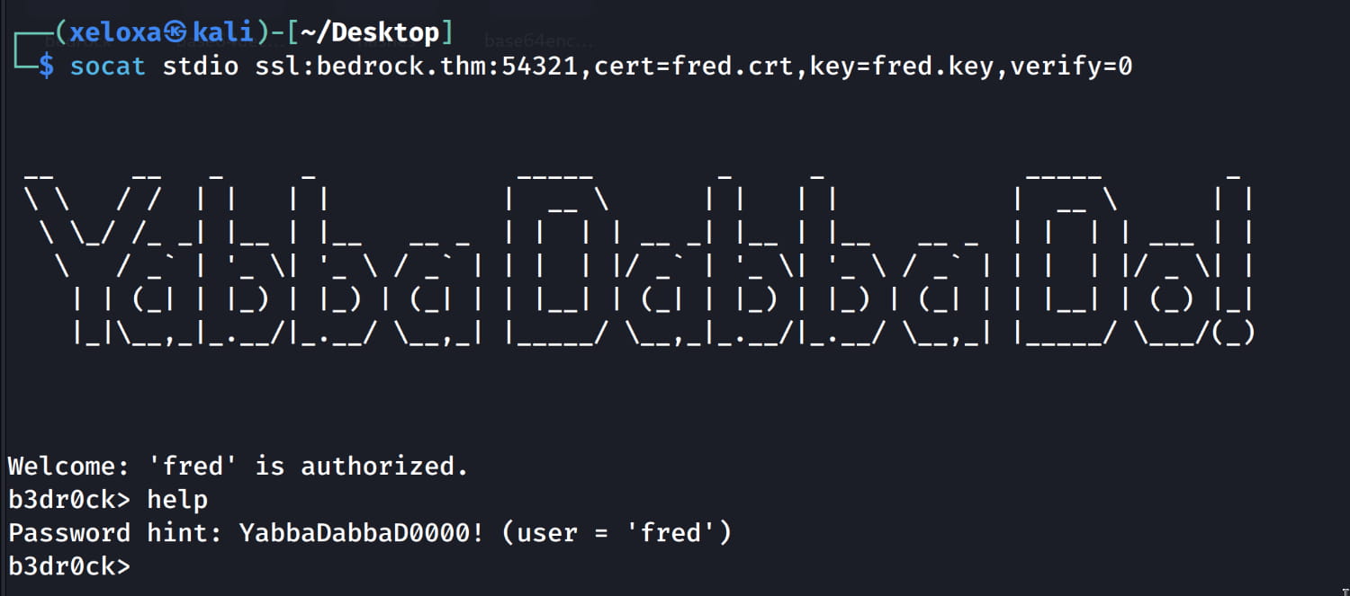 $socat stdio ssl:bedrock.thm:54321,cert=fred.crt,key=fred.key,verify=0