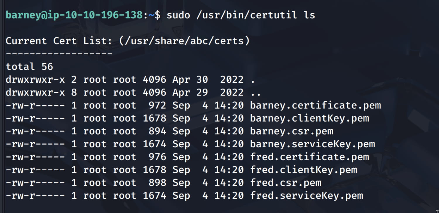 When we do a simple analysis with sudo -l, we see that the barney user can run the /usr/bin/certutil binary with sudo privileges.
