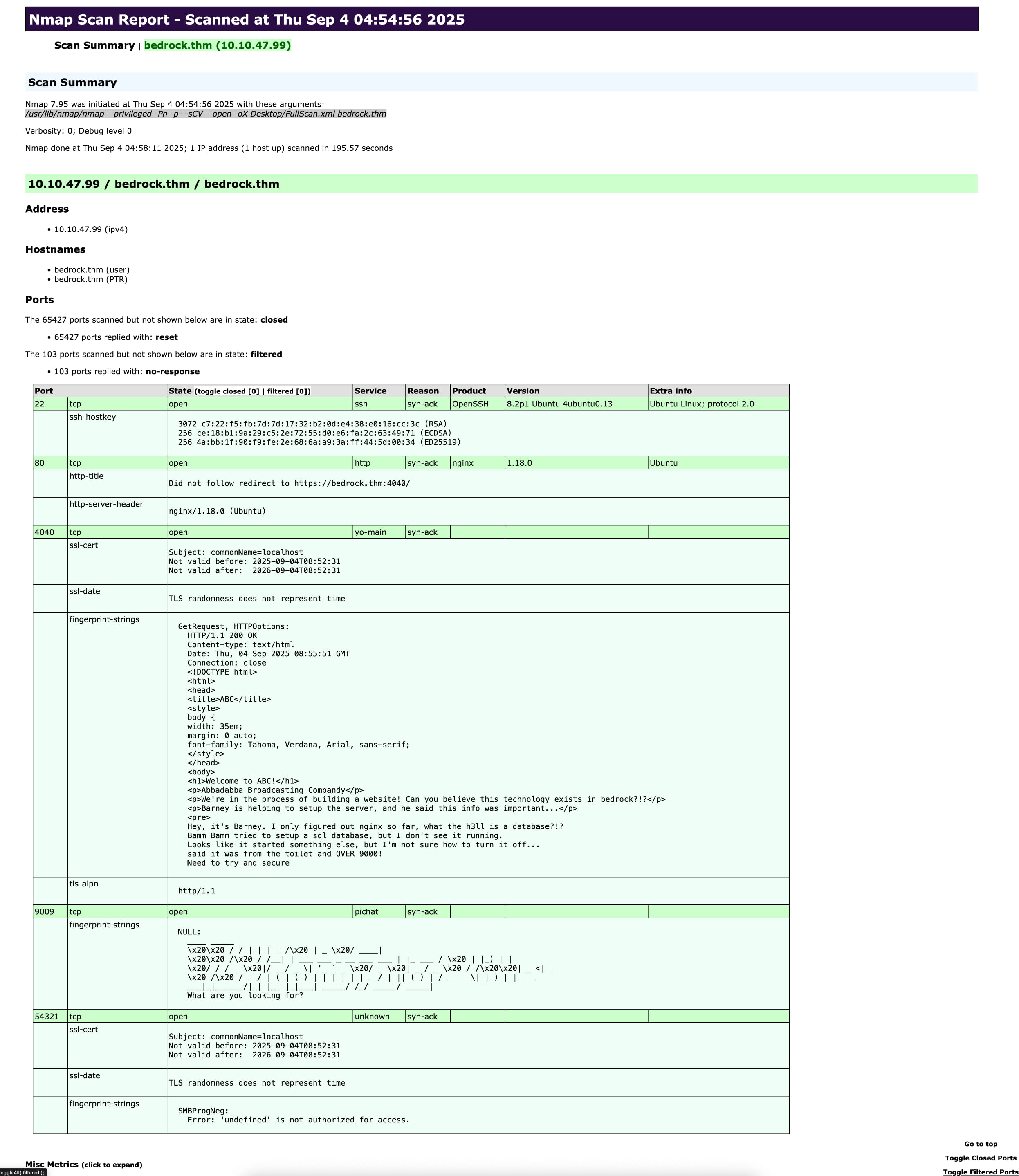 Let's perform an nmap scan with the command nmap bedrock.thm -Pn -p- -sCV --open -oX Desktop/FullScan.xml and save the output. Now, let's convert this output to HTML format with xsltproc FullScan.xml -o bedrock-result.html and examine it.
