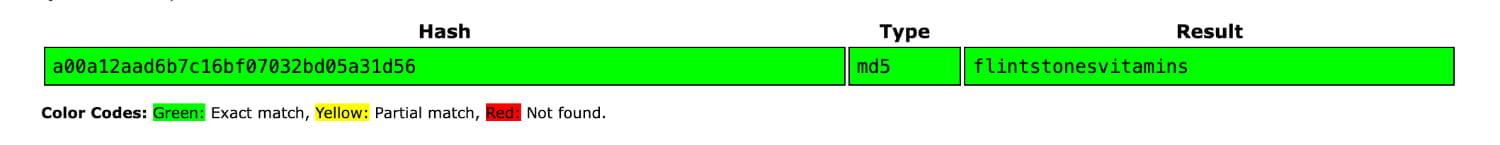 From here we found the hash a00a12aad6b7c16bf07032bd05a31d56 and determined that it is MD5. When we crack this on https://crackstation.net/, we get the result flintstonesvitamins. Now it encodes this again with base-64... just kidding, that was it.