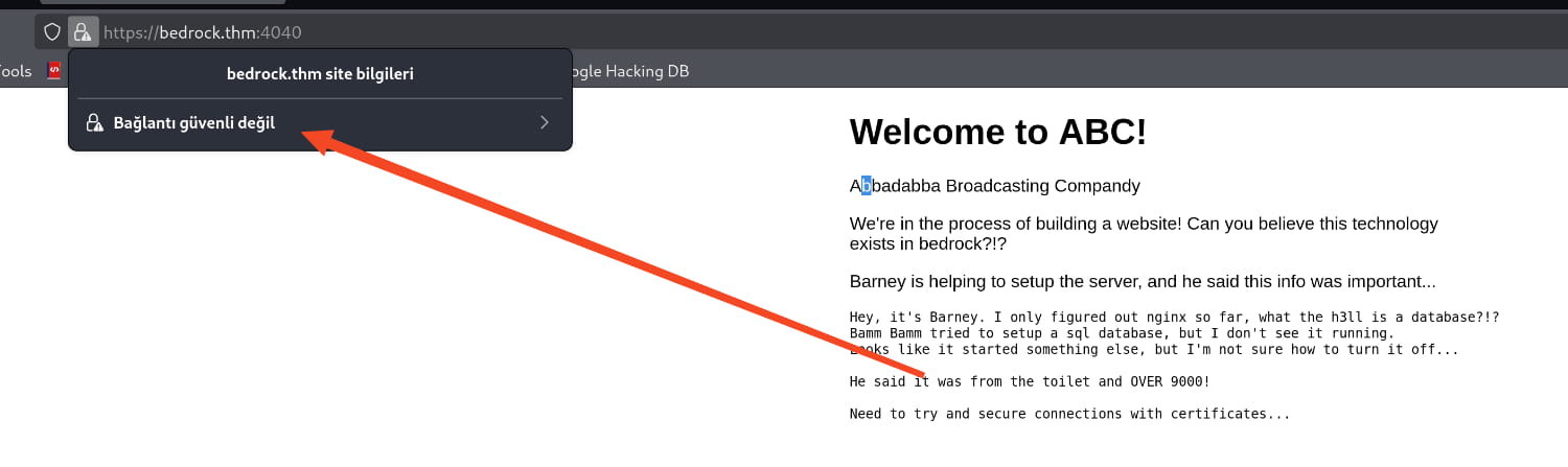 We have several ports here. Now let's go to bedrock.thm:80 and see what happens. And it automatically redirected us to the bedrock.thm:4040 (TLS) port.