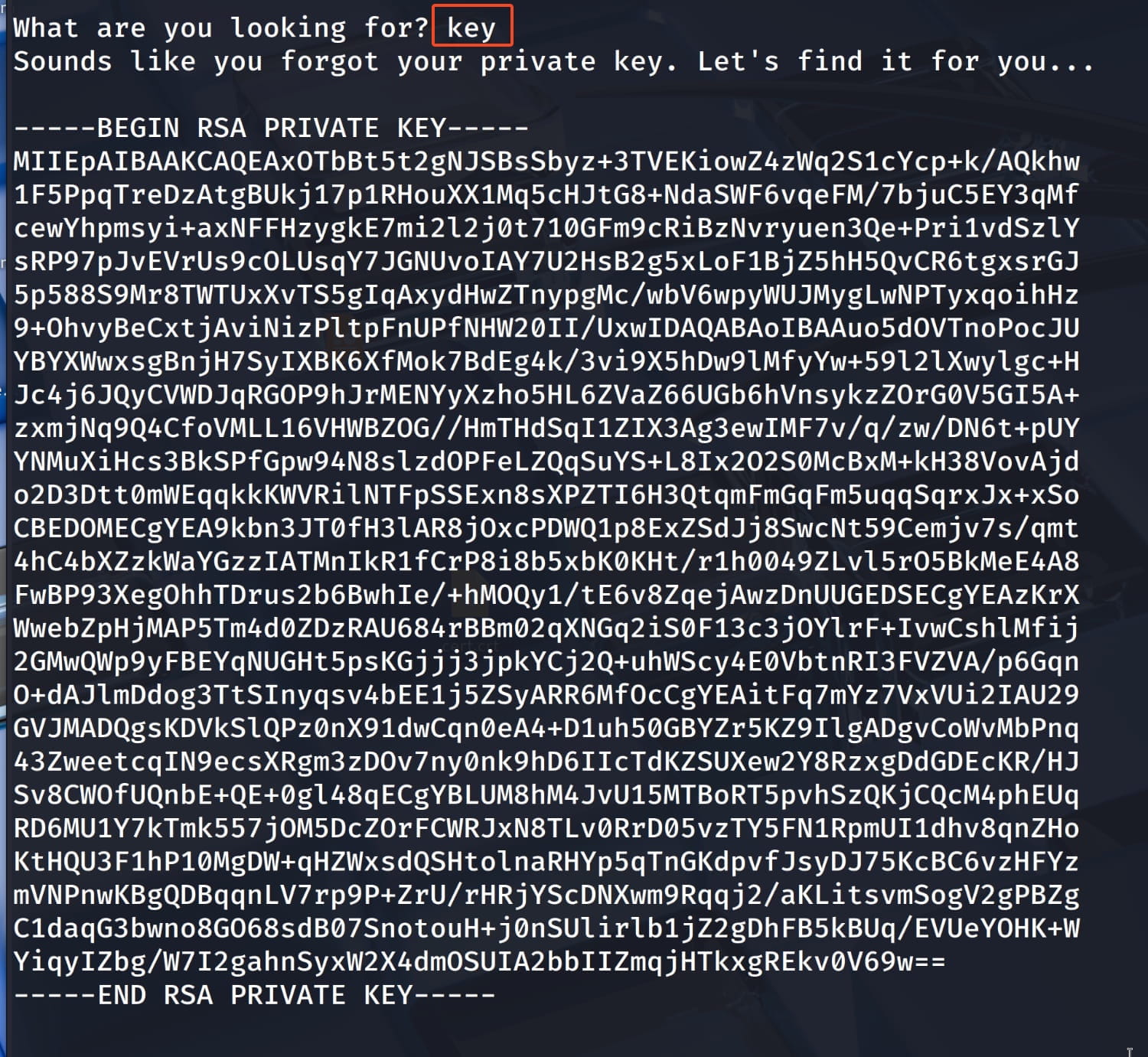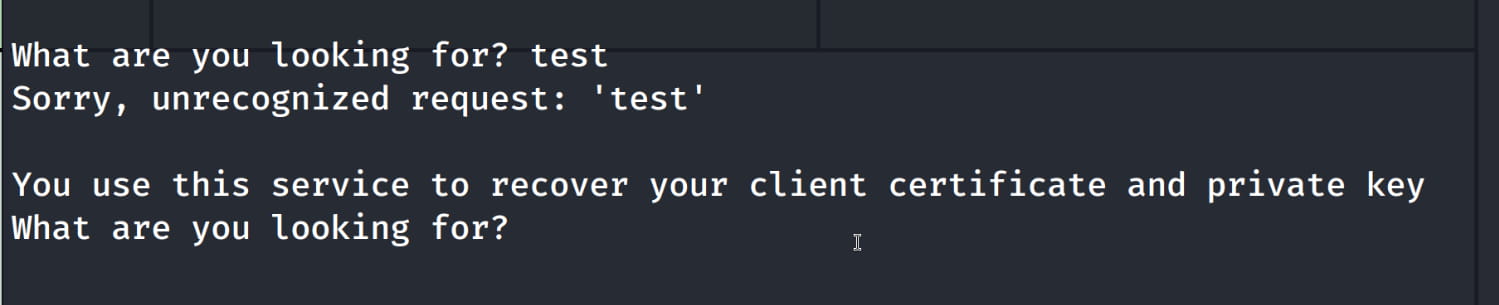 When we enter a random text here, we get the response You use this service to recover your client certificate and private key. And we understand that we are in the right place. Now we search the internet for basic pichat usage and see that we can use the help command.