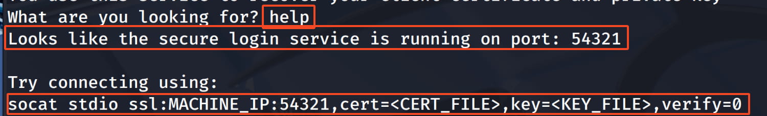 From here, we see that there is a login service running on port 54321 that uses TLS, which we also saw in our nmap output. And it says we can connect to it with the following command;