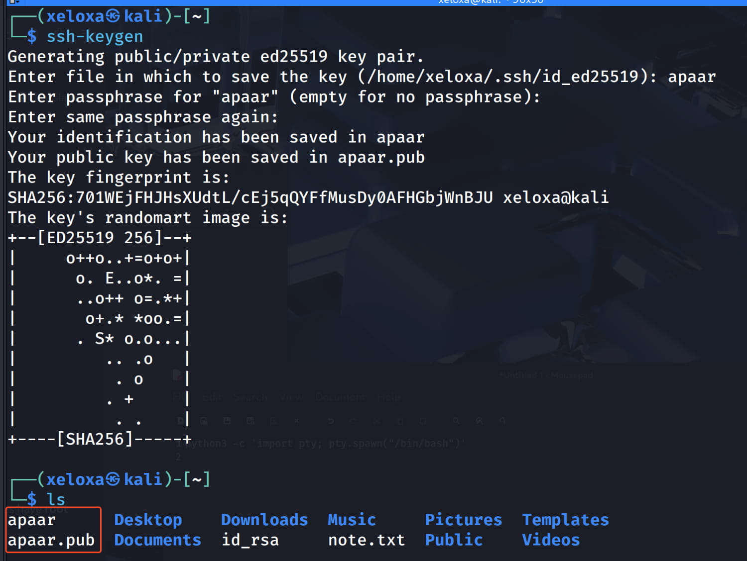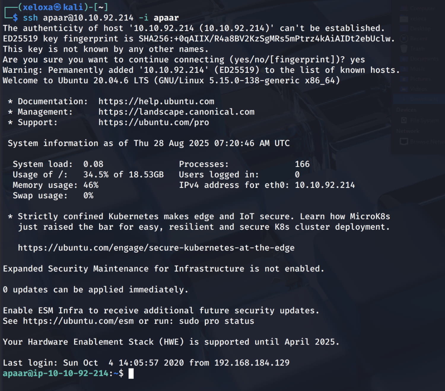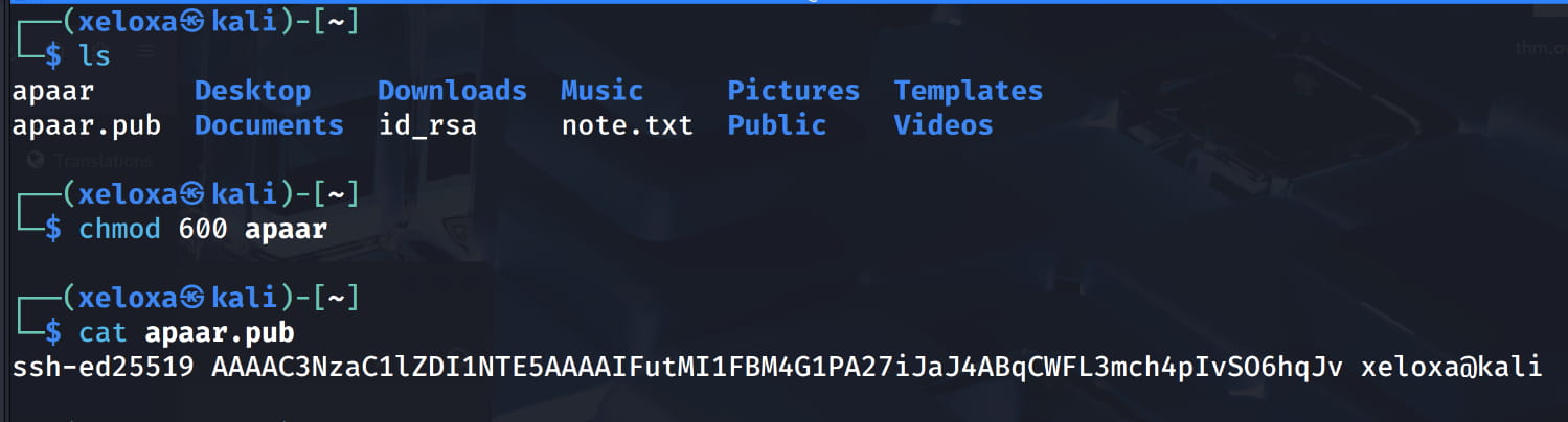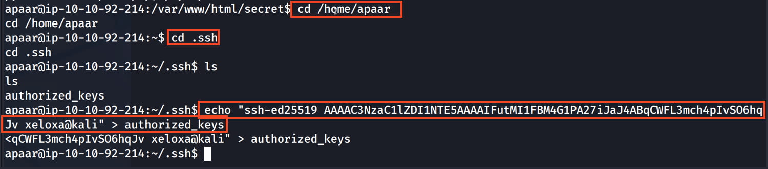 appar.pubcontent to theapaaruser's.ssh/authorized_keysfile on the target system with the following command.bash echo "ssh-ed25519 AAAAC3NzaC1lZDI1NTE5AAAAIFutMI1FBM4G1PA27iJaJ4ABqCWFL3mch4pIvSO6hqJv xeloxa@kali" > authorized_keys