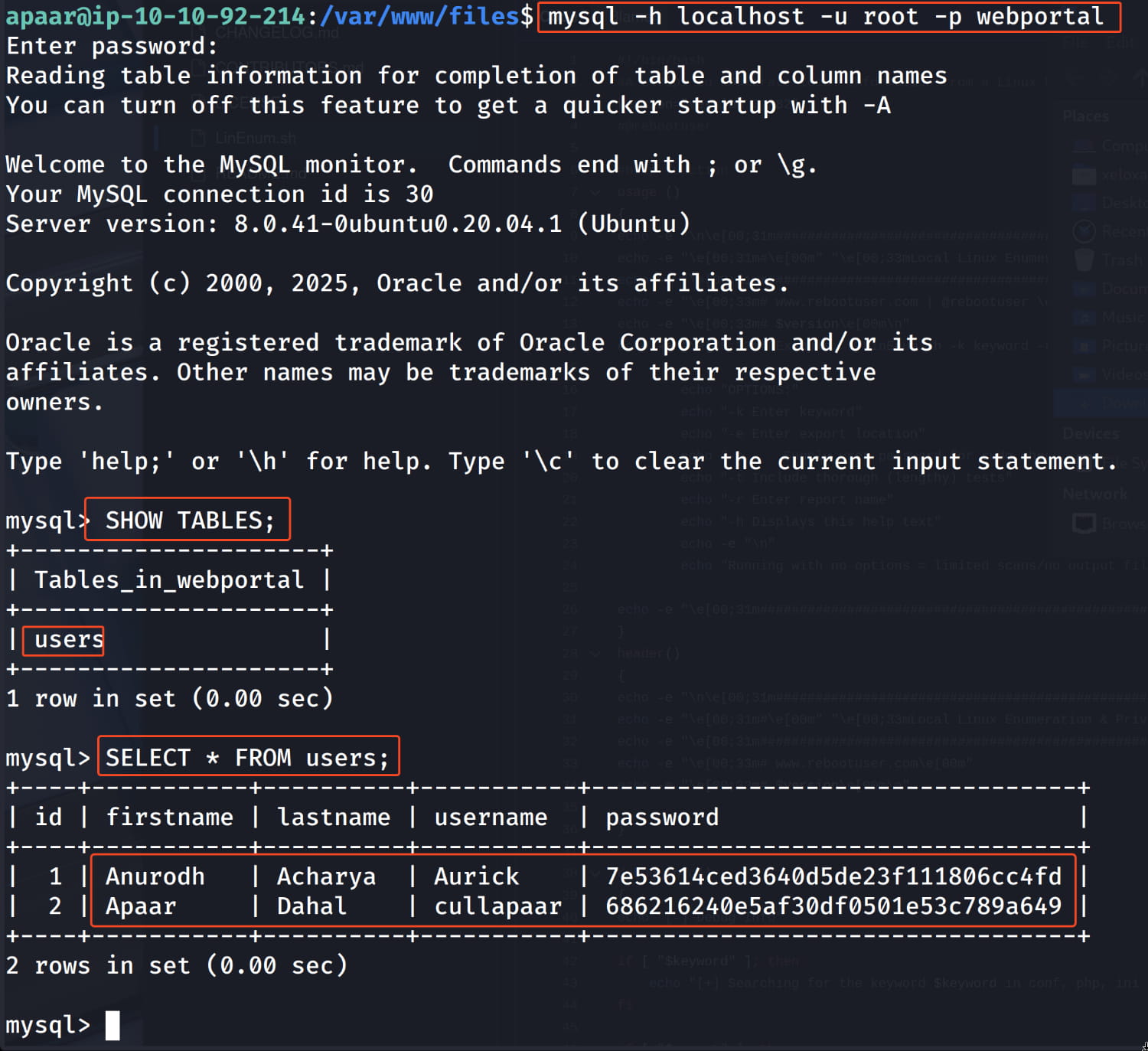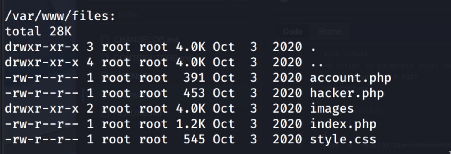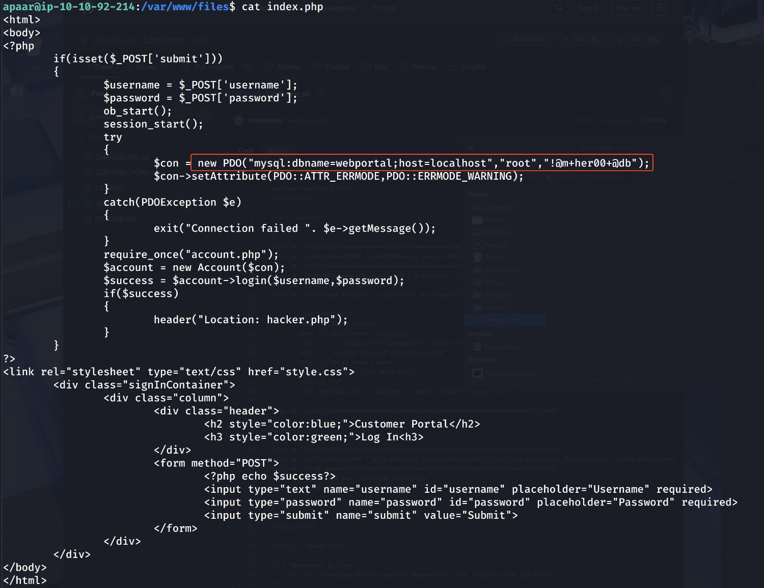 The php files in the /var/www/files path. So let's start from here. When we examine the files, we see exposed database credentials in the index.php file.