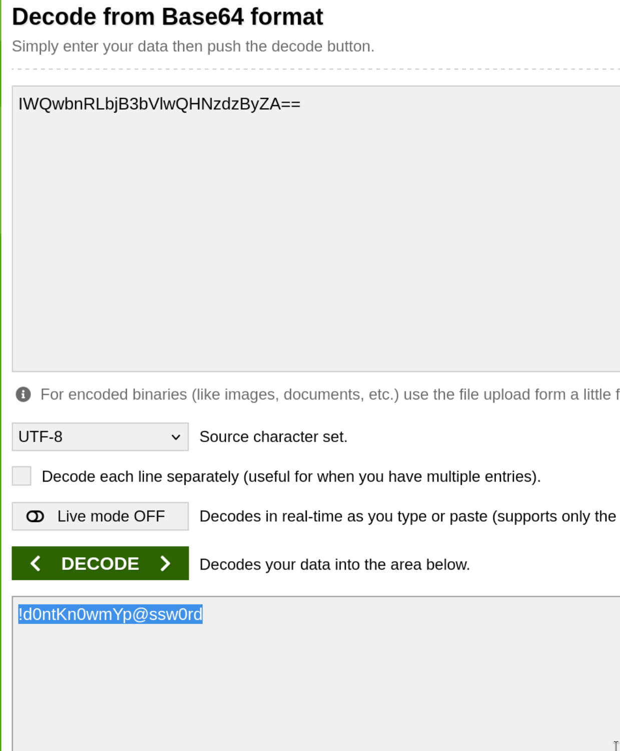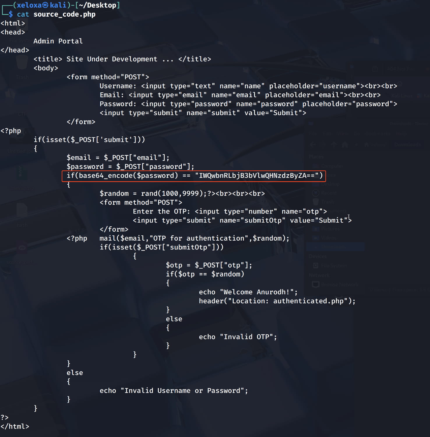 And we find the password pass1word. Inside the zip, we find a file named source_code.php. When we examine this, we get a hash encoded with base64. When we decode this, we get the password for the anurodh user.