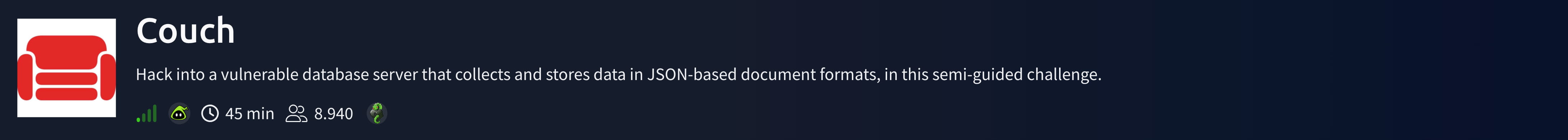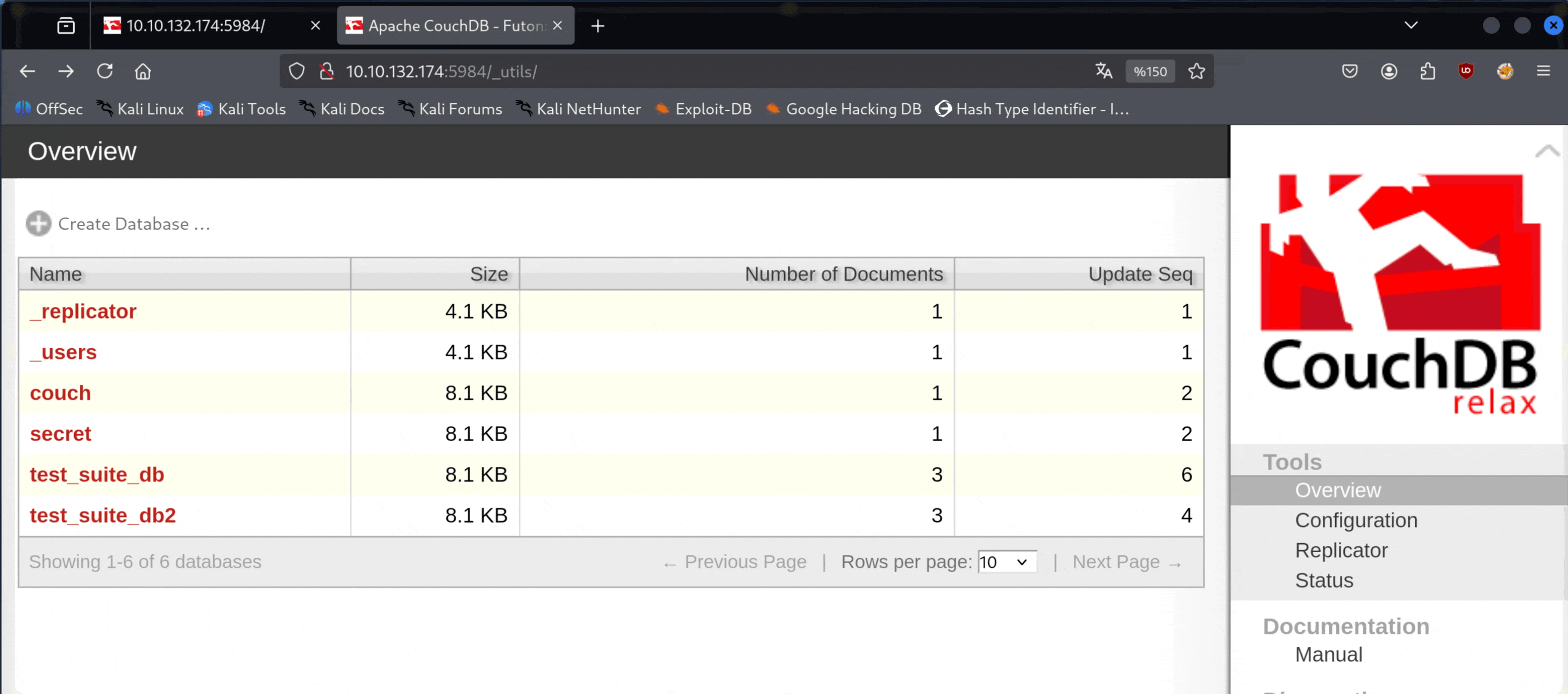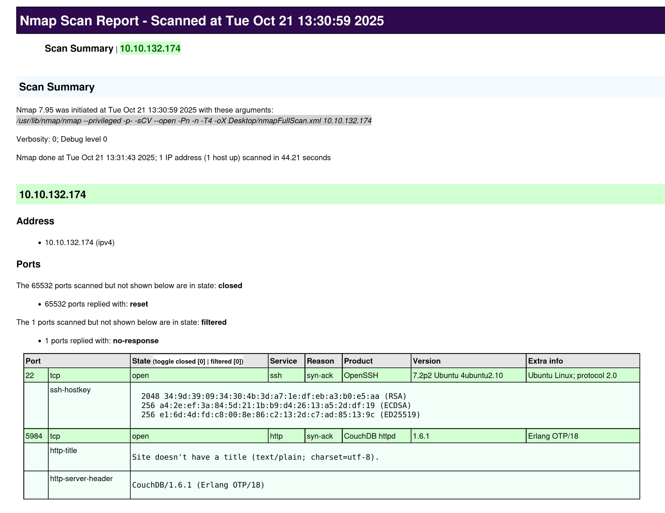 When we open the generated html file, we see that ports 22 and 5984 are open. Upon researching CouchDB, we find that it is a NoSQL database developed by Apache.