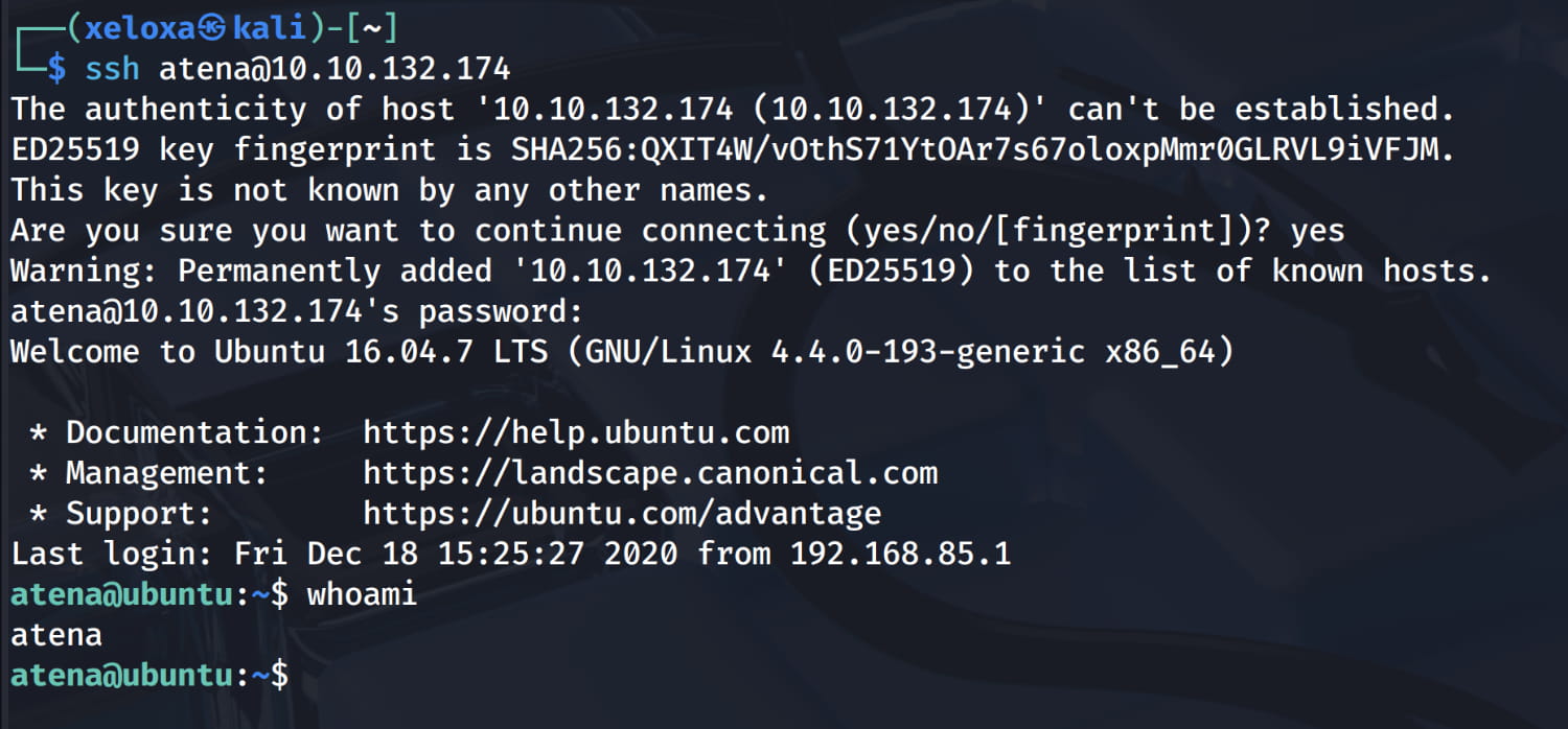 From here, we obtain the credentials atena:t4qfzcc4qN##. Now, let's try to log in via SSH with them.