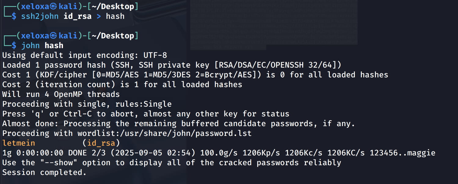 We are prompted for a password for the SSH key. Let's try to crack it using John the Ripper. (The room provided a wordlist, but I didn't use it as the password was already in John's default wordlist). Now, let's get the hash with ssh2john and crack it.