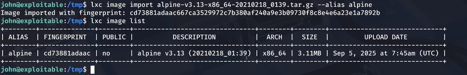 $lxc image import alpine-v3.13-x86_64-20210218_0139.tar.gz --alias alpine