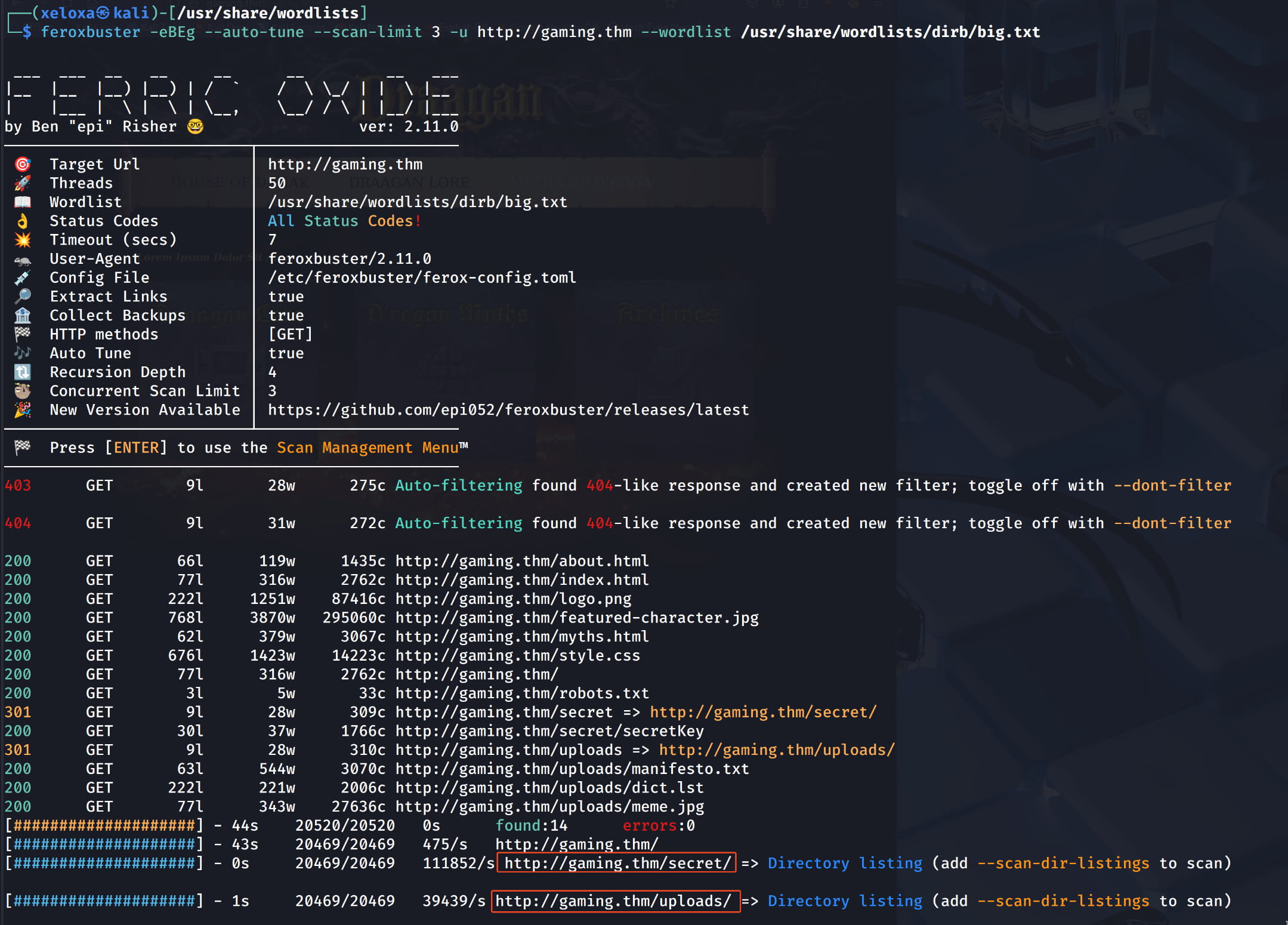 $feroxbuster -eBEg --auto-tune --scan-limit 3 -u http://gaming.thm --wordlist /usr/share/wordlists/dirb/big.txt