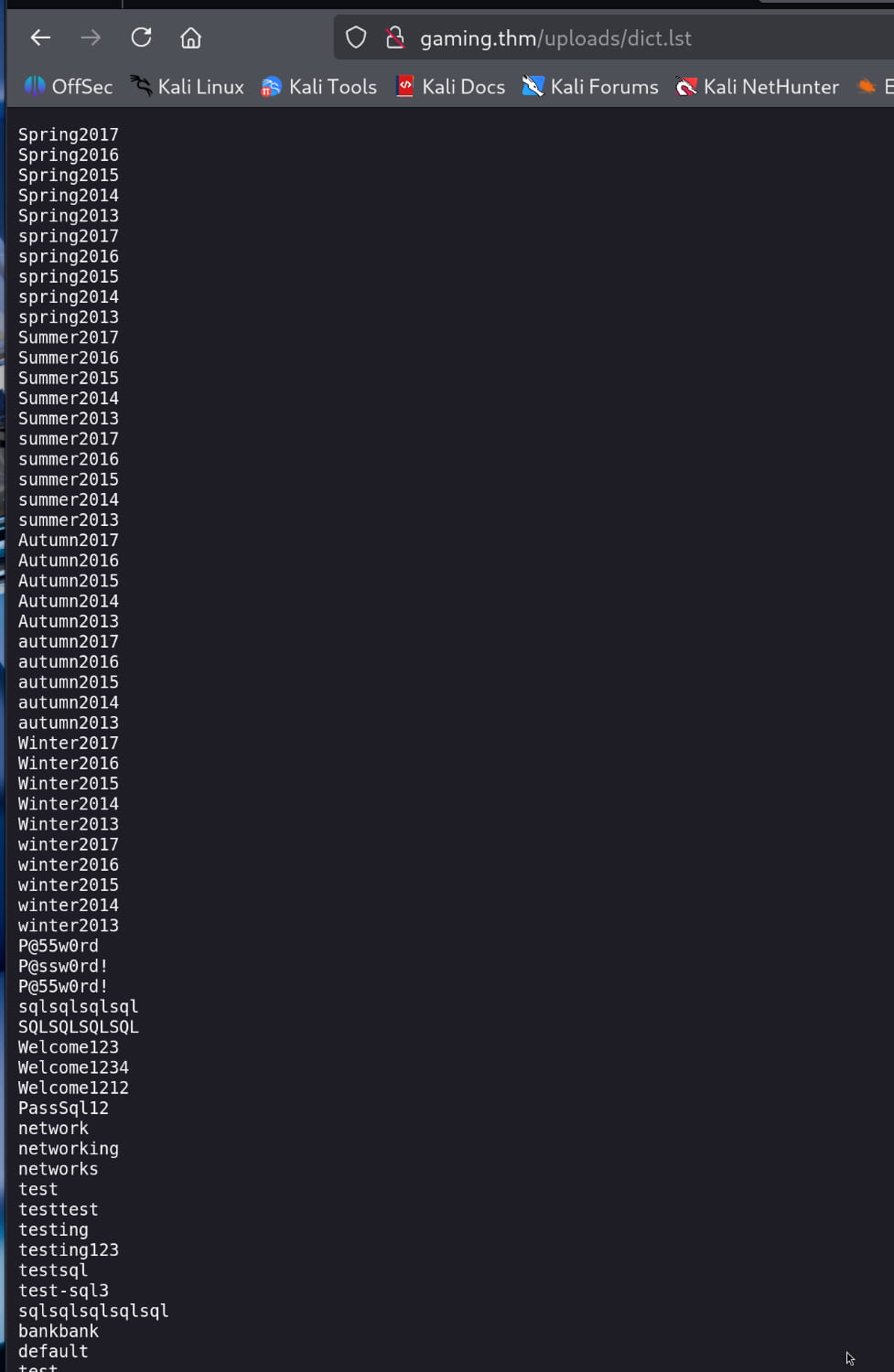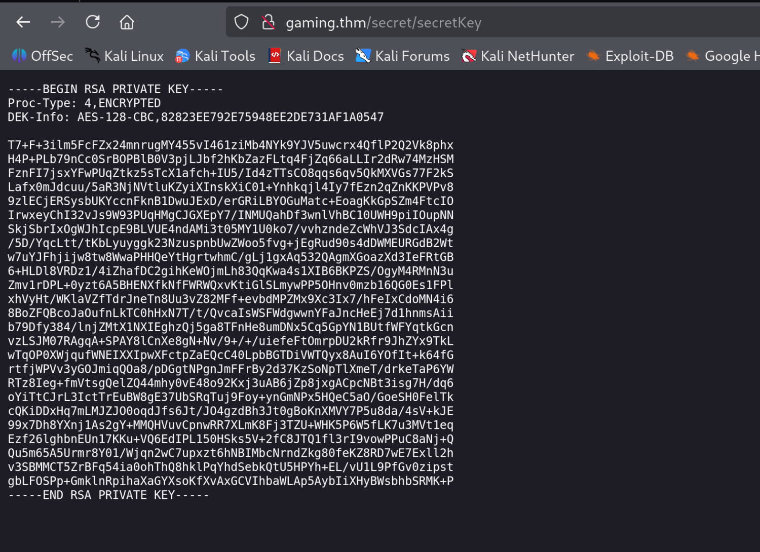 Here, we get the /secret/secretKey file. We see that it contains an SSH key. Additionally, we find a wordlist at /uploads/dict.lst.