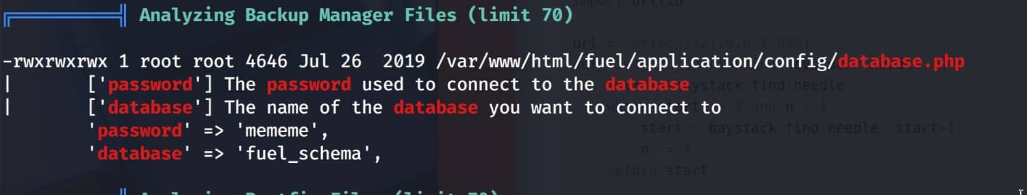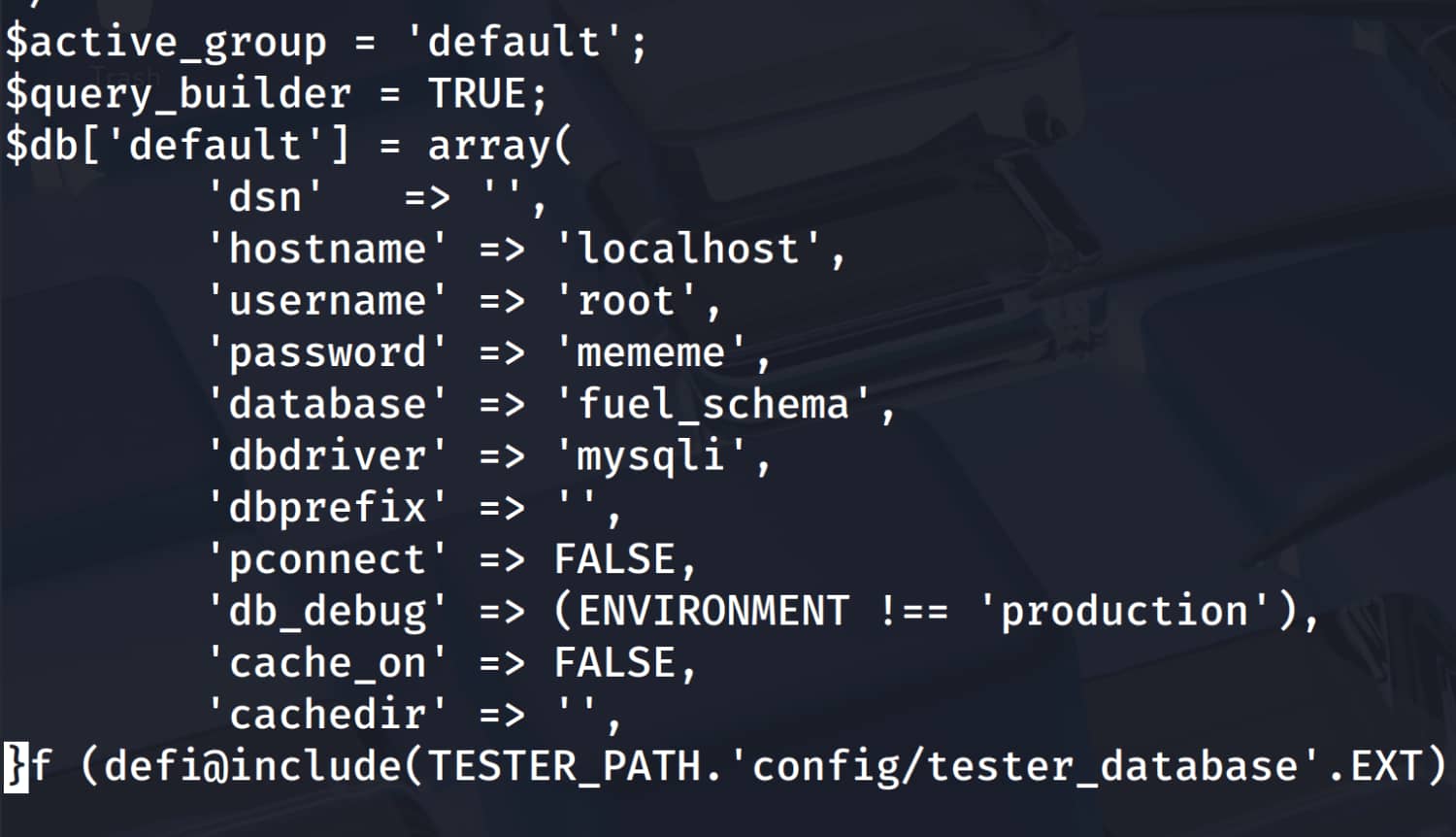 Our analysis has identified the file /var/www/html/fuel/application/config/database.php as noteworthy. Upon examining the contents of this file, we find the pair root:mememe.