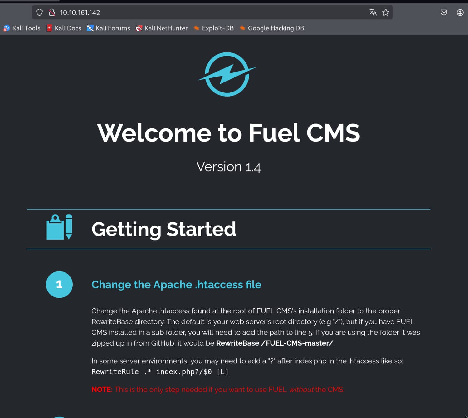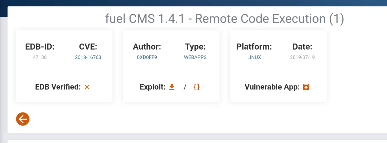 There is a login form in the Fuel directory, and we can log in with the admin:admin pair as specified on the default page and access the interface, but we cannot upload files from the interface as there are too many controls. Instead, we can search for the Fuel CMS 1.4 version on the internet and find any exploits if available.