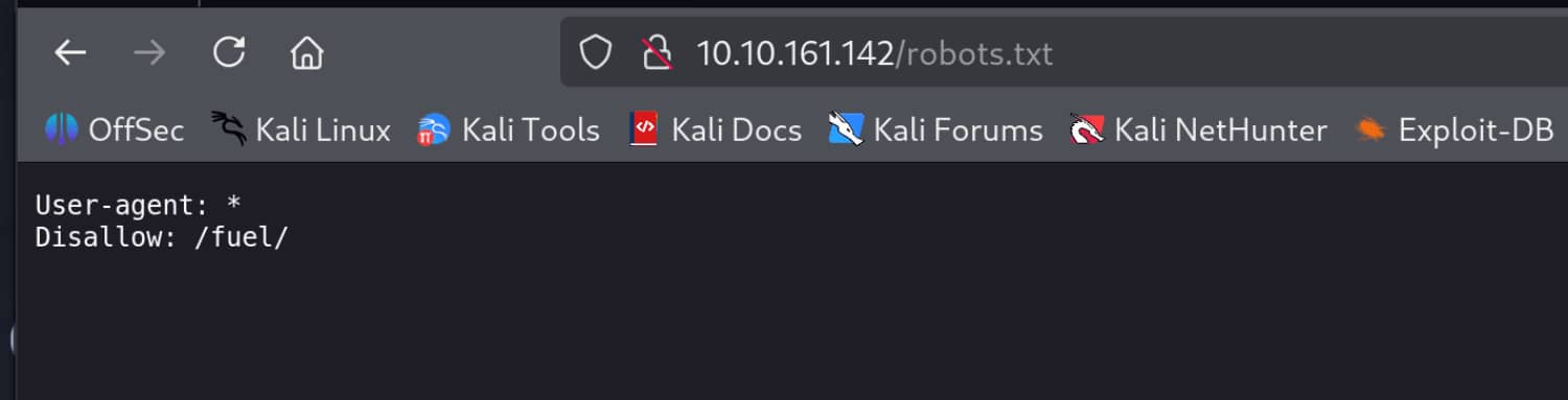 Only port 80 is open, and we have a website here and a /fuel directory, as we can see from /robots.txt.
